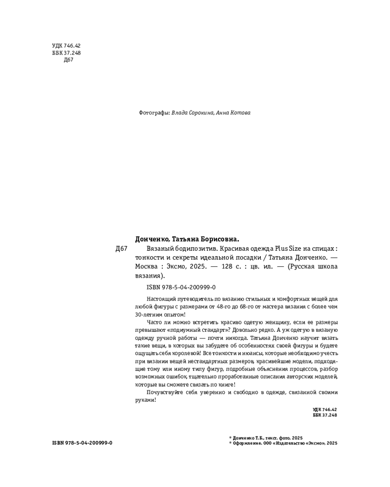 Серия: Русская школа вязания «Вязание Plus Size — это легко, интересно и доступно каждому! В этой книге вы найдете все, чтобы создать одежду, которая будет отражать вашу индивидуальность и стиль!» — Татьяна Донченко |