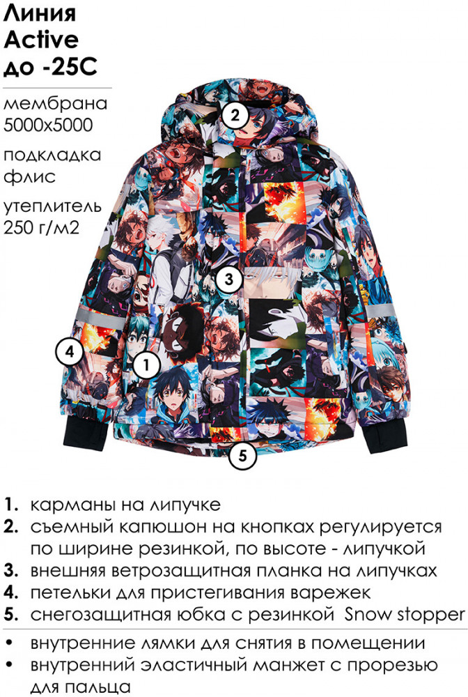 Зимняя детская куртка для мальчика. Особенности модели: Линия Active; Температурный режим до -25С; мембрана 5000×5000, подкладка — флис; утеплитель 250 г/м; боковые карманы на липучке; съемный капюшон с адаптацией по ширине резинкой; внешняя ветрозащитная планка на липучках; эргономичные рукава; внутренние лямки для снятия в помещении; снегозащитная юбка с резинкой Snow stopper. Утепленная горнолыжная куртка — идеальный выбор для активного отдыха на свежем воздухе в зимний период. Инновационный утеплитель и флисовая подкладка сохраняют тепло морозную погоду. Мембранный материал делает этот яркий и модный комбинезон непромокаемым: мембрана не пропускает влагу снаружи, но выводит её изнутри, что крайне важно во время подвижных игр и занятий спортом.