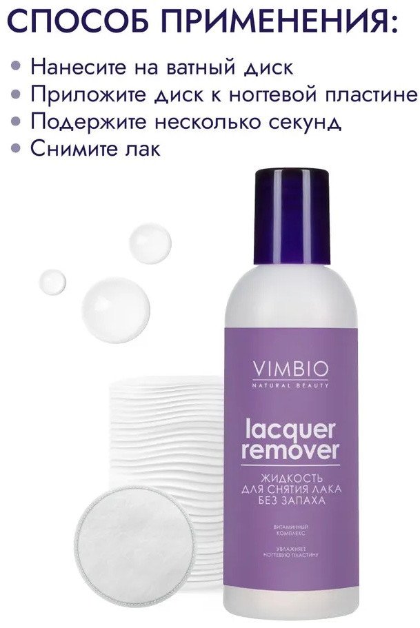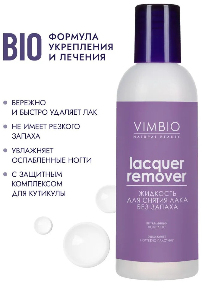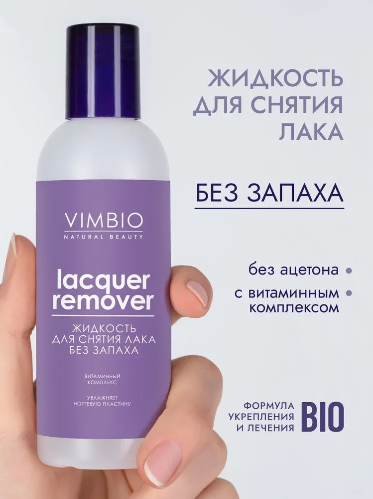 Жидкость для снятия лака VimBio Natural Beauty без запаха и ацетона, благодаря безопасной формуле деликатно очищает ногтевую пластину, одновременно увлажняя и смягчая ногтевую пластину.