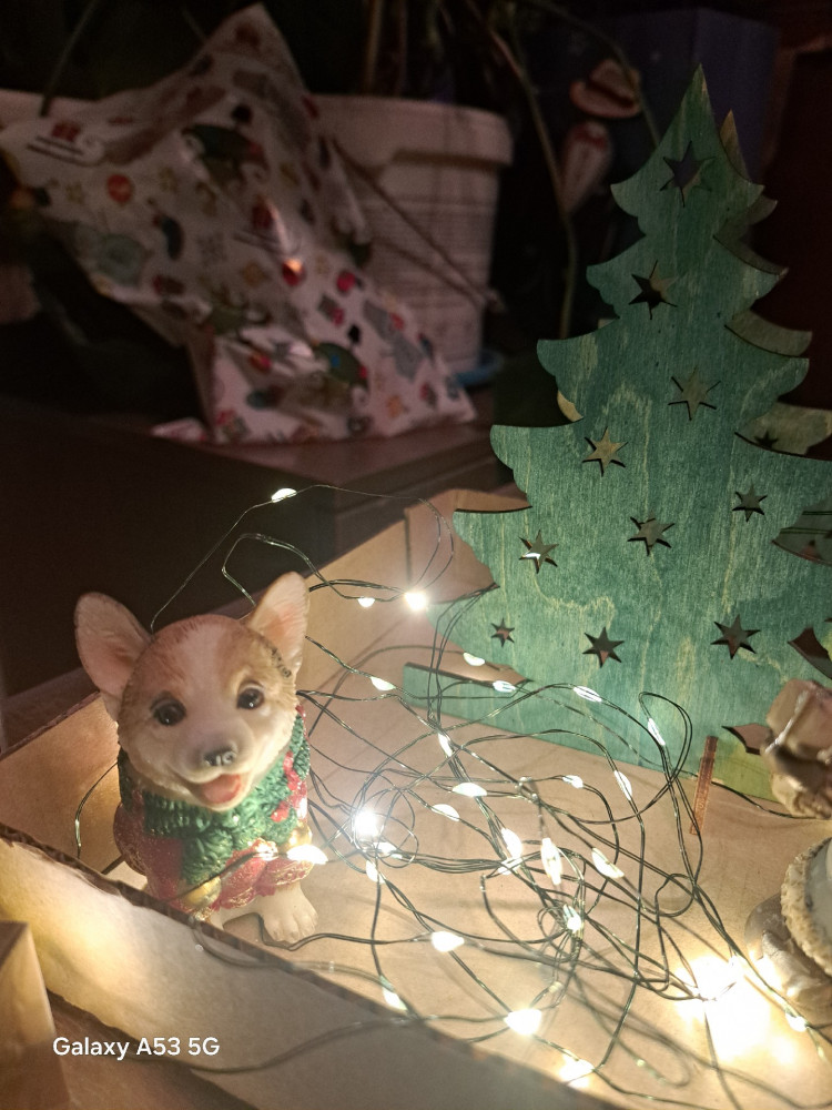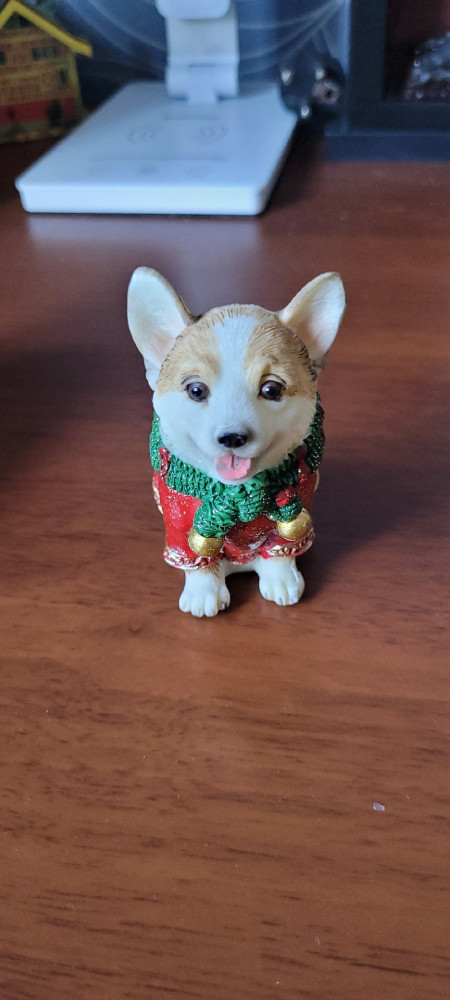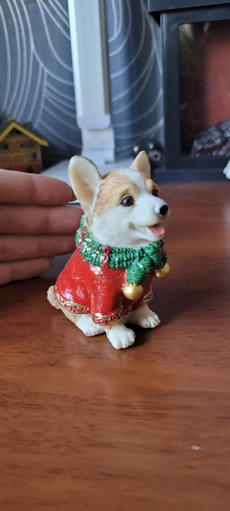 симпатичный, пришел в коробке, целый без повреждений. красивый щеночек, поставили на новогодний стол