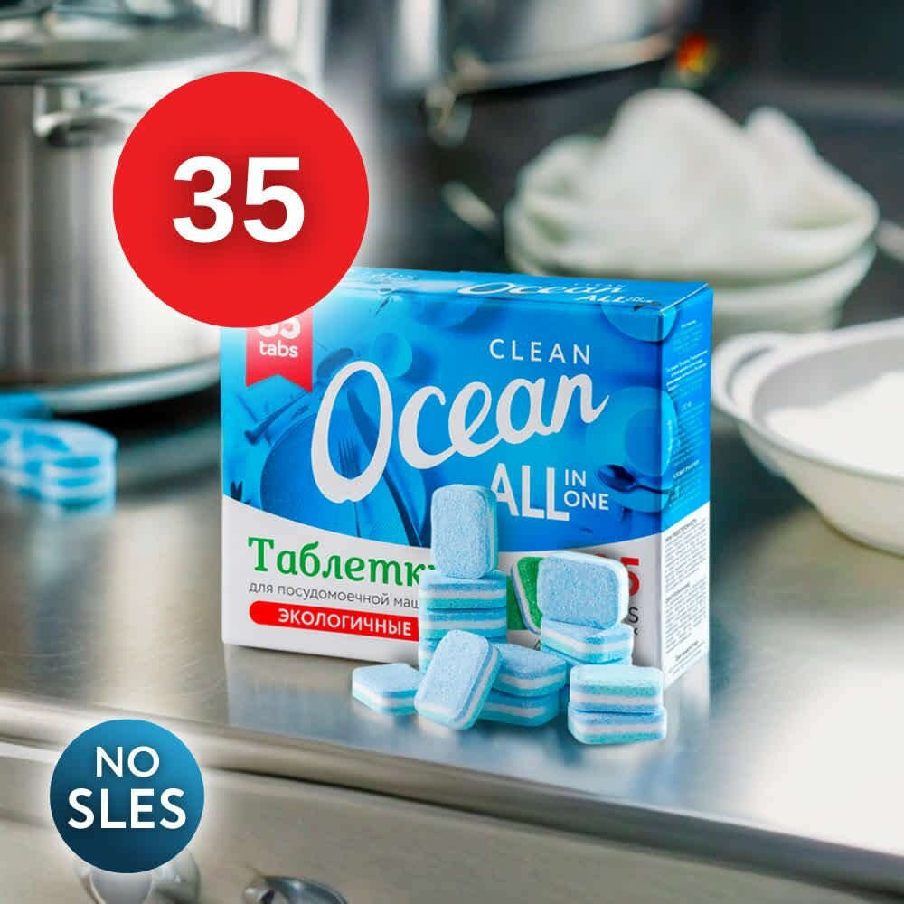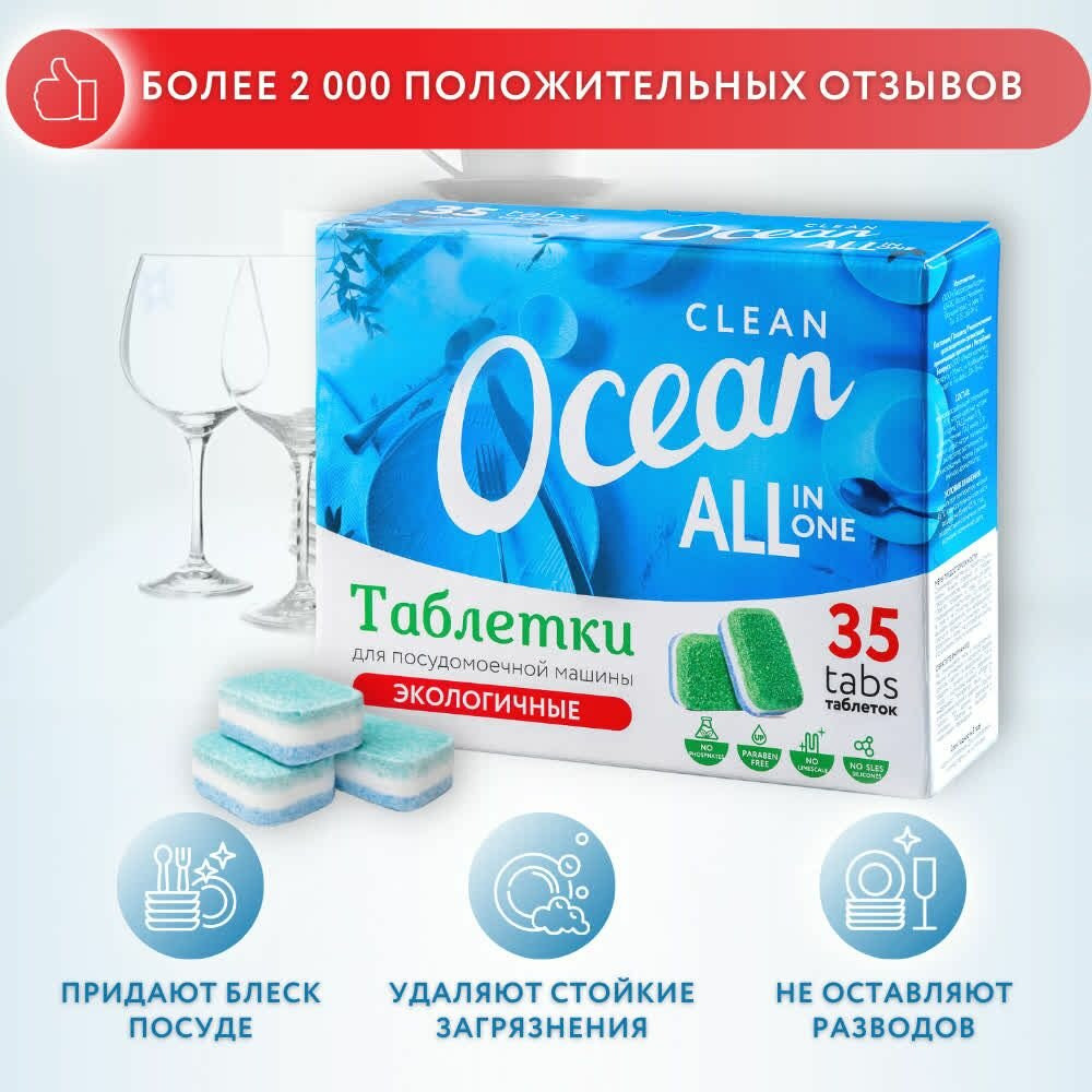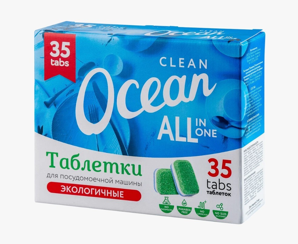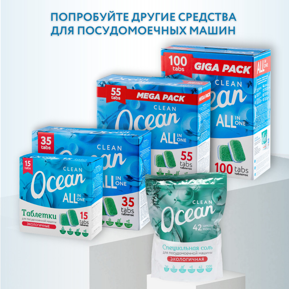 Таблетки для посудомоечных машин Clean Ocean: 7 функций в одной таблетке! Средство деликатно воздействует на стекло, предотвращая помутнение, эффективно борется с жиром и сильными загрязнениями, нейтрализует неприятные запахи, смягчает воду, предупреждает образование известкового налета, гарантирует долгую работу посудомоечной машины. Таблетки эффективны даже на сокращенных программах (не менее 60 мин.), придают блеск столовым приборам и сияние стеклу, не оставляют разводов и полностью смываются водой. Таблетки "Ocean Clean" деликатно и тщательно позаботятся о Вашей посуде, завершив Ваш день по-настоящему приятно.