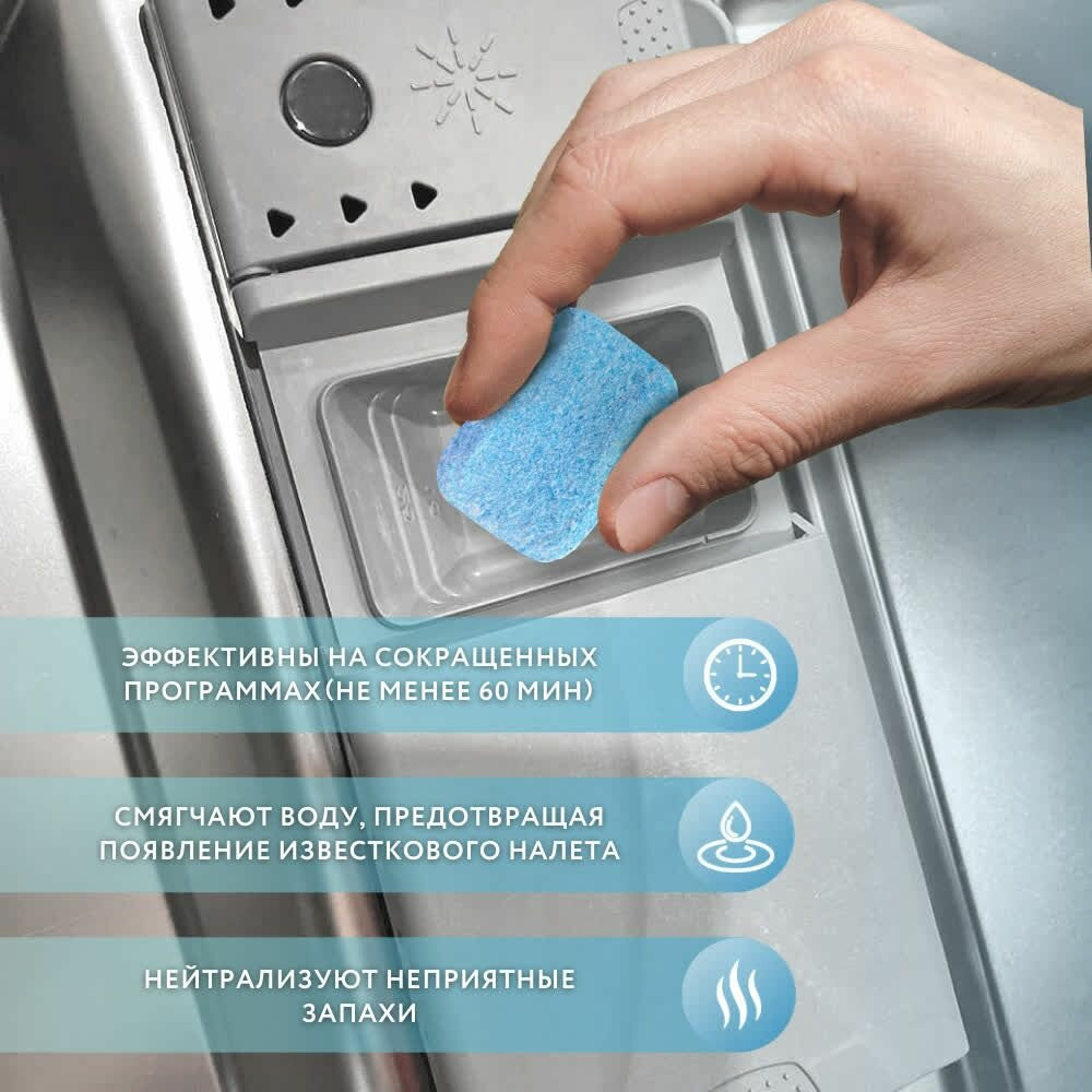 • смягчает воду, предупреждает образование известкового налета, гарантирует долгую работу посудомоечной машины;