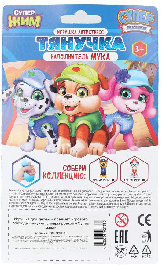 💳 Оплатить за товар можно при получении 🇰🇿 Есть бесплатная доставка по Казахстану 🎁 Копите бонусы с каждой покупки Игрушка-тянучка «Суперщенки» ТМ «СуперЖим» станет прекрасным подарком для маленьких непосед. Эта забавная игрушка в виде отважного щенка-спасателя непременно понравится вашему ребёнку, он с удовольствием будет растягивать её в руках, наблюдая за тем, как она меняет и восстанавливает свою форму. Фигурка наполнена мукой, поэтому тактильно приятна на ощупь. Кроме того, игрушка является прекрасным тренажёром для детских пальцев. |
