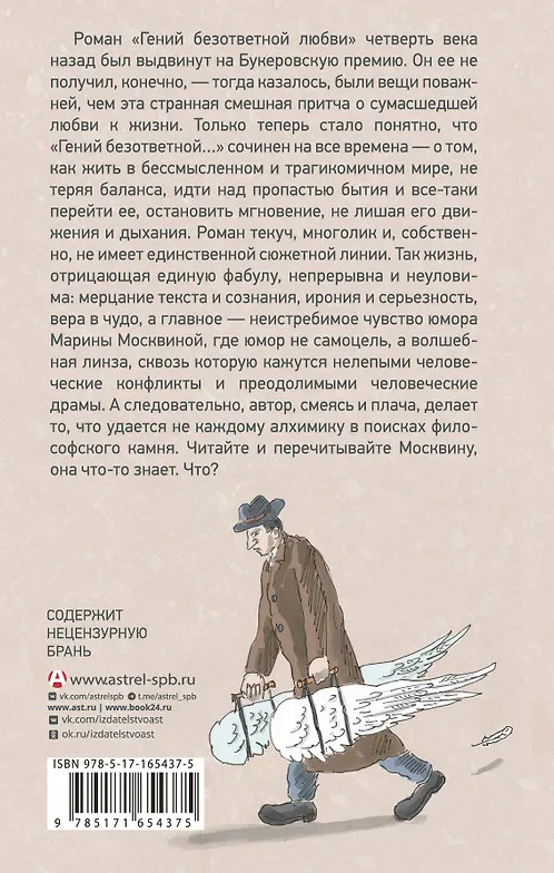Серия: Люди, которые всегда со мной Роман «Гений безответной любви» четверть века назад был выдвинут на Букеровскую премию. Он ее не получил, конечно, — тогда, казалось, были вещи поважней, чем эта странная, смешная притча о сумасшедшей любви к жизни. Только теперь стало понятно, что «Гений безответной...» сочинен на все времена — о том, как жить в бессмысленном и трагикомичном мире, не теряя баланса, идти над пропастью бытия и все-таки перейти ее, остановить мгновение, не лишая его движения и дыхания. Роман текуч, многолик и, собственно, не имеет единственной сюжетной линии. Так жизнь, отрицающая единую фабулу, непрерывна и неуловима: мерцание текста и сознания, ирония и серьезность, вера в чудо, а главное — неистребимое чувство юмора Марины Москвиной, где юмор не самоцель, а волшебная линза, сквозь которую кажутся нелепыми человеческие конфликты и преодолимыми человеческие драмы. А следовательно, автор, смеясь и плача, делает то, что удается не каждому алхимику в поисках философского камня. Читайте и перечитывайте Москвину, она что-то знает. Что? |