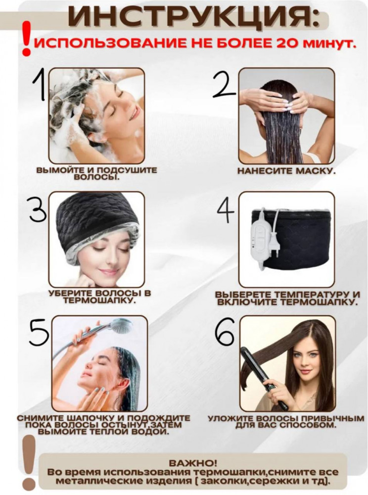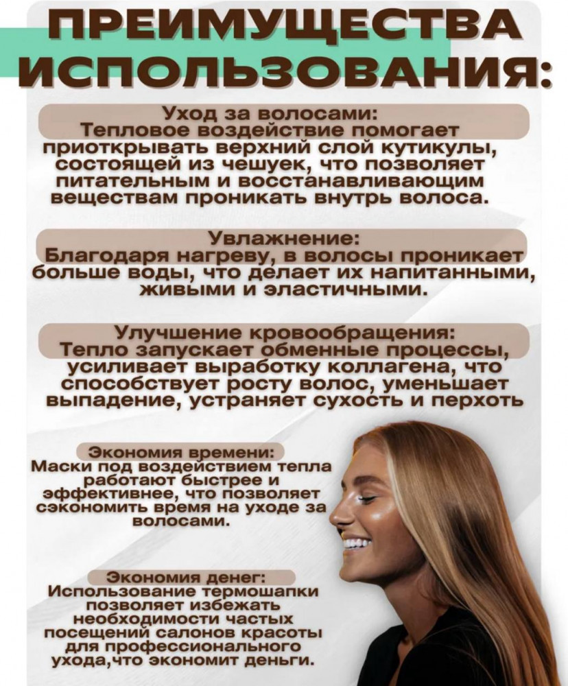 Электрическая термошапка предназначена для профессионального и домашнего ухода за волосами. Благодаря термовоздействию она помогает раскрыть кутикулу волос, усиливая впитывание питательных и восстанавливающих компонентов. Это делает уходовые процедуры — маски, масла, флюиды и бальзамы — значительно более эффективными. |