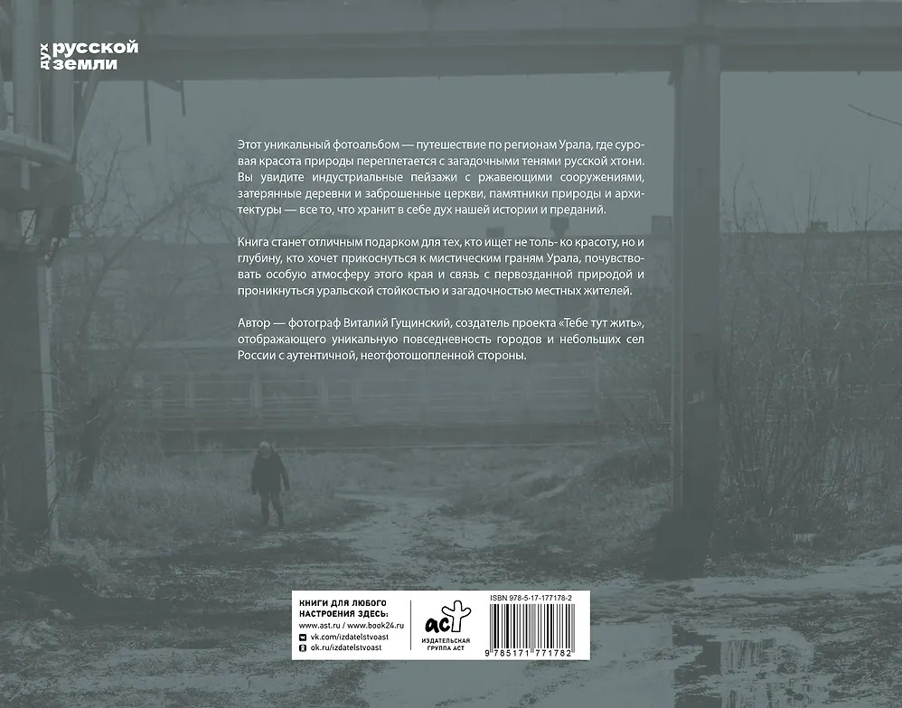 Серия: Дух русской земли Этот уникальный фотоальбом — путешествие по регионам Урала, где суровая красота природы переплетается с загадочными тенями русской хтони. Вы увидите индустриальные пейзажи с ржавеющими сооружениями, затерянные деревни и заброшенные церкви, памятники природы и архитектуры — всё то, что хранит в себе дух нашей истории и преданий. Книга станет отличным подарком для тех, кто ищет не только красоту, но и глубину, кто хочет прикоснуться к мистическим граням Урала, почувствовать особую атмосферу этого края и связь с первозданной природой, и проникнуться уральской стойкостью и загадочностью местных жителей. |
