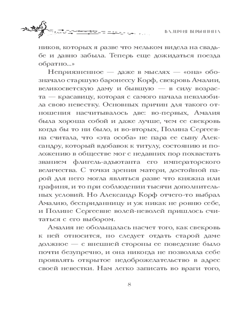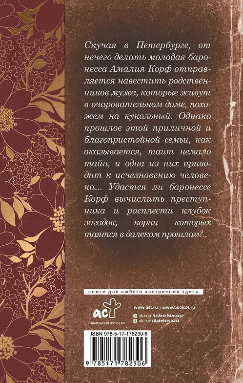 Серия: Исторические детективы Валерии Вербининой Скучая в Петербурге, от нечего делать молодая баронесса Амалия Корф отправляется навестить родственников мужа, которые живут в очаровательном доме, похожем на кукольный. Однако прошлое этой приличной и благопристойной семьи, как оказывается, таит немало тайн, и одна из них приводит к исчезновению человека... Удастся ли баронессе Корф вычислить преступника и расплести клубок загадок, корни которых таятся в далеком прошлом?.. |