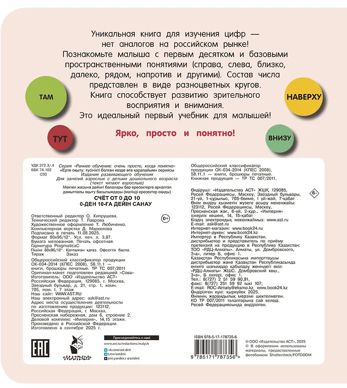 💳 Оплатить за товар можно при получении 🇰🇿 Есть бесплатная доставка по Казахстану 🎁 Копите бонусы с каждой покупки Серия: Раннее обучение: очень просто, когда понятно «Счёт до 10» — это первая книжка для знакомства ребёнка с миром чисел. На каждой странице — крупная яркая цифра и понятия, развивающие пространственное мышление: справа, слева, близко, далеко, рядом, напротив и т. д. Лаконичный, но визуально насыщенный дизайн поможет малышам освоить первый десяток и разовьёт зрительное восприятие и внимание. Кроме того, состав числа представлен в виде кругов. Все элементы точно выверены и имеют определённый размер, цвет, месторасположение, соответствующее конкретной цифре. Качественная мелованная бумага и закруглённые углы страниц делают книгу прочной и безопасной — она не порвётся и не помнётся, а ребёнок не порежется! |
