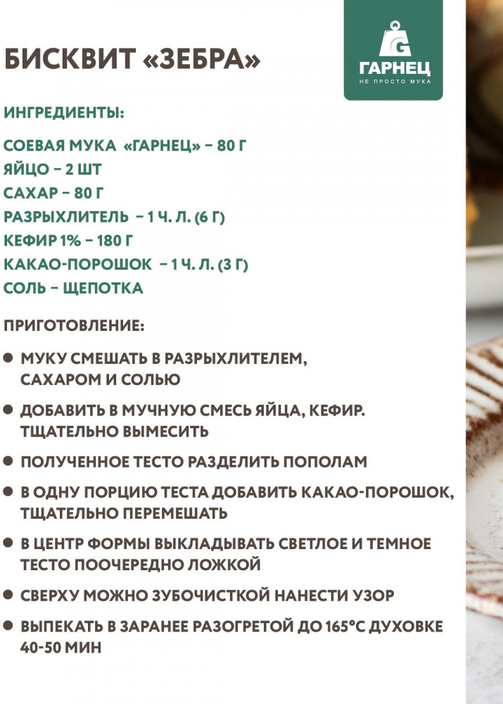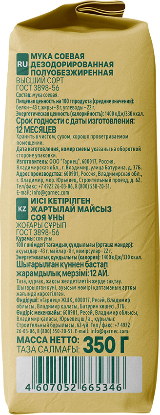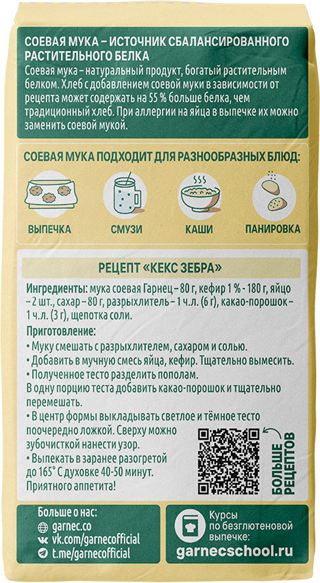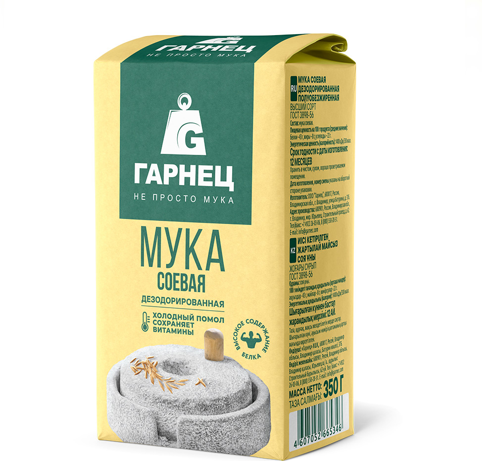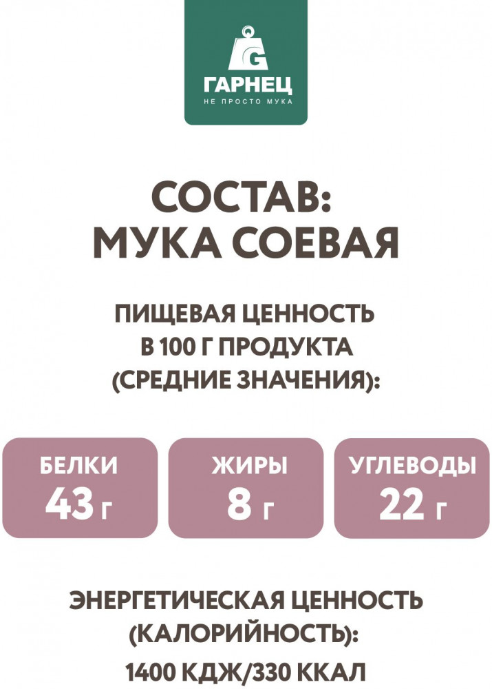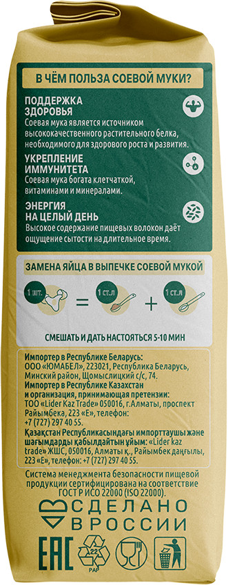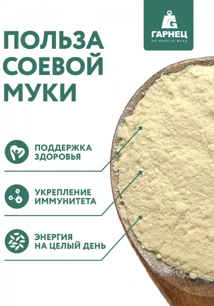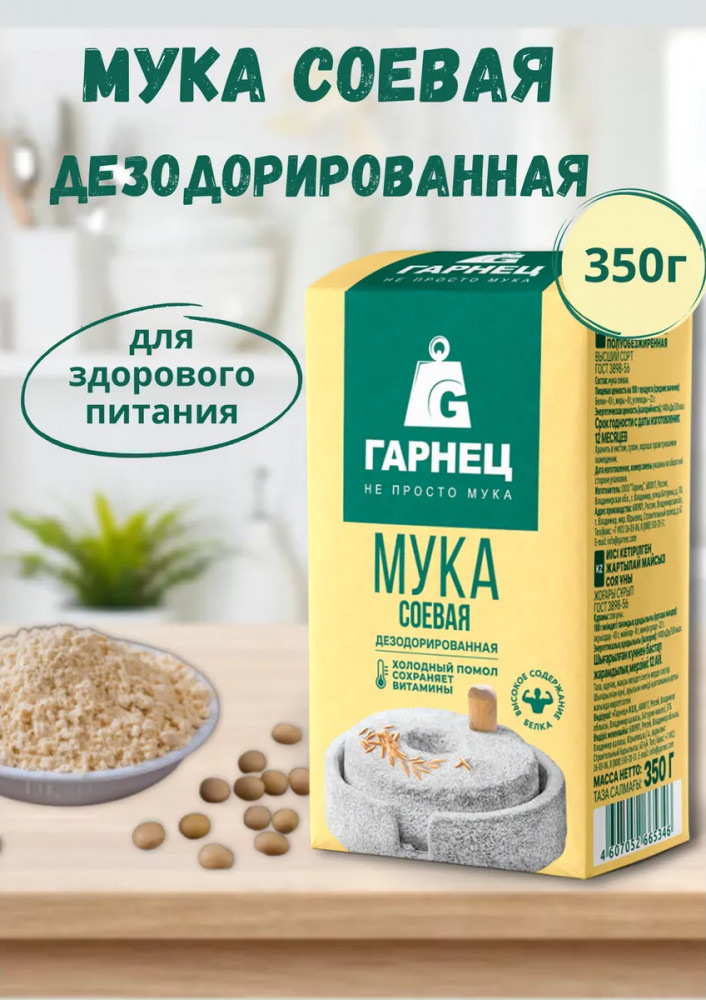 Применение: добавляйте соевую муку в ваши любимые рецепты для придания им особой питательной ценности. Используйте её отдельно или смешивайте с пшеничной мукой для получения идеальной текстуры и вкуса ваших блюд.