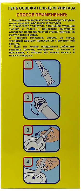 • совместите толкатель с меньшей стороной тюбика с гелем и поместите выпускное отверстие напротив чистой стенки унитаза на месте протока воды;