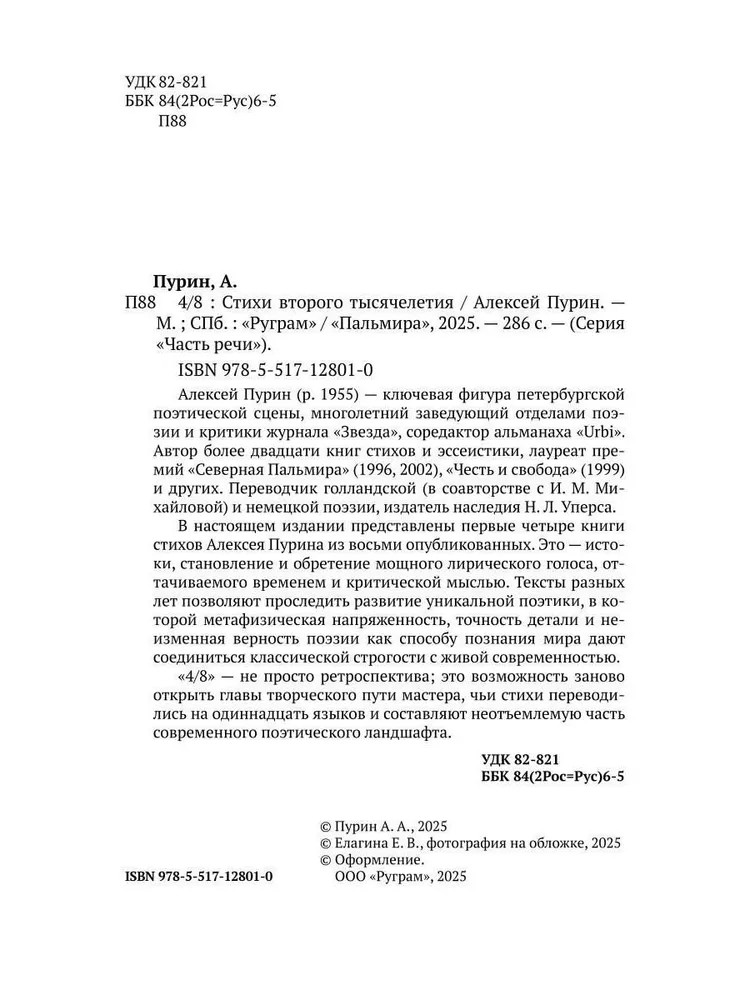 «4/8» — не просто ретроспектива; это возможность заново открыть главы творческого пути мастера, чьи стихи переведены на одиннадцать языков и составляют неотъемлемую часть современного поэтического ландшафта. |
