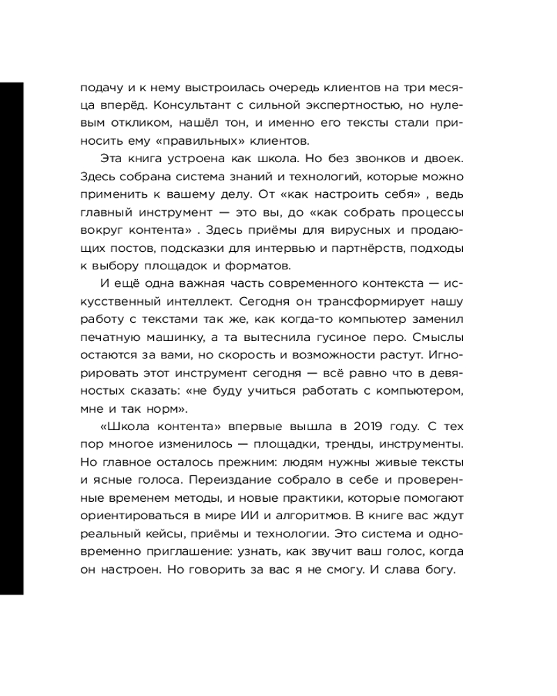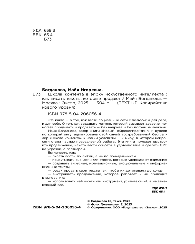 💳 Оплатить за товар можно при получении 🇰🇿 Есть бесплатная доставка по Казахстану от 1 дня 🎁 Копите бонусы с каждой покупки Серия: TEXT UP. Копирайтинг нового уровня Эта книга — о том, как вести социальные сети с пользой: и для дела, и для себя. О том, как создавать контент, который вызывает доверие, помогает продвигать и продавать — без надрыва и без погони за лайками. Майя Богданова, автор книги «Новый нейрокопирайтинг» и курсов по копирайтингу, адаптировала свой самый востребованный бестселлер «Школа контента» к новым условиям — к миру, в котором нейросети стали частью повседневной работы. Эта книга поможет выстроить продвижение, начать вести соцсети в удовольствие и сделать GPT не угрозой, а партнером. |