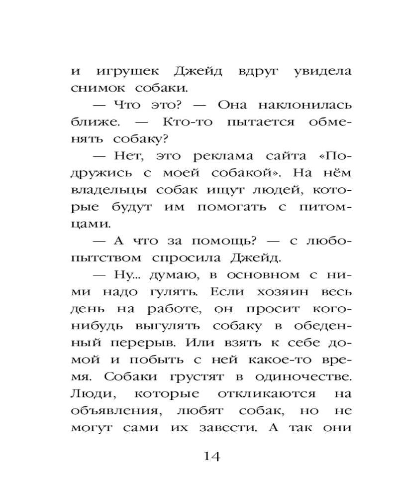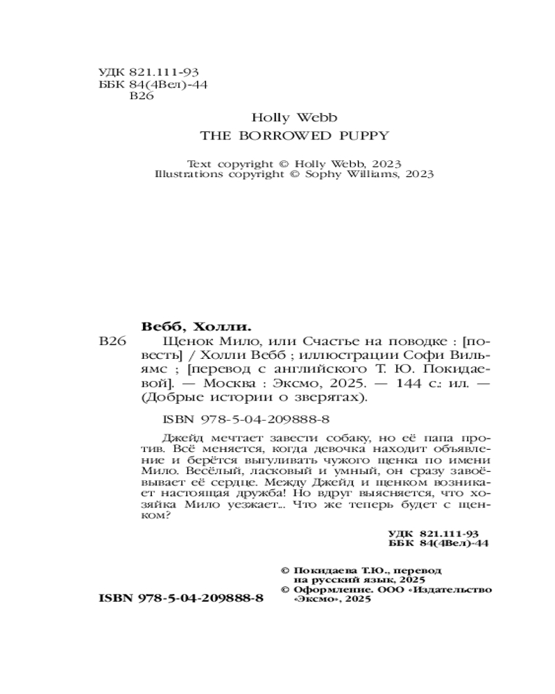 Серия: Холли Вебб. Добрые истории о зверятах. Мировой бестселлер Джейд мечтает завести собаку, но её папа против. Всё меняется, когда девочка находит объявление и берётся выгуливать чужого щенка по имени Мило. Весёлый, ласковый и умный, он сразу завоёвывает её сердце. Между Джейд и щенком возникает настоящая дружба! Но вдруг выясняется, что хозяйка Мило уезжает... Что же теперь будет с щенком? |