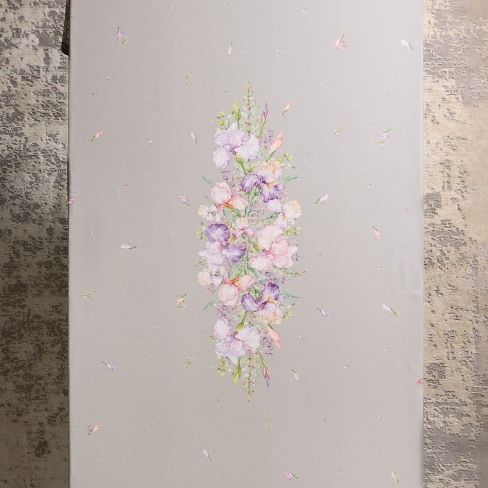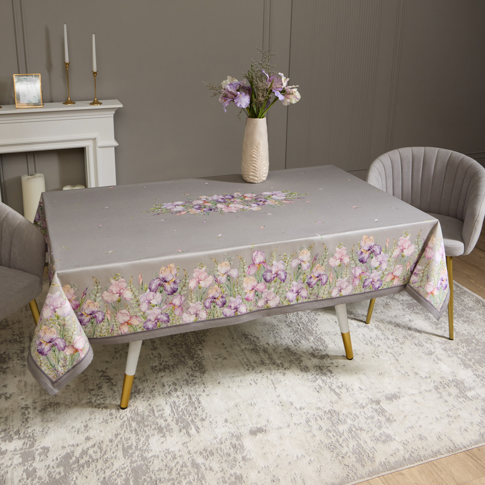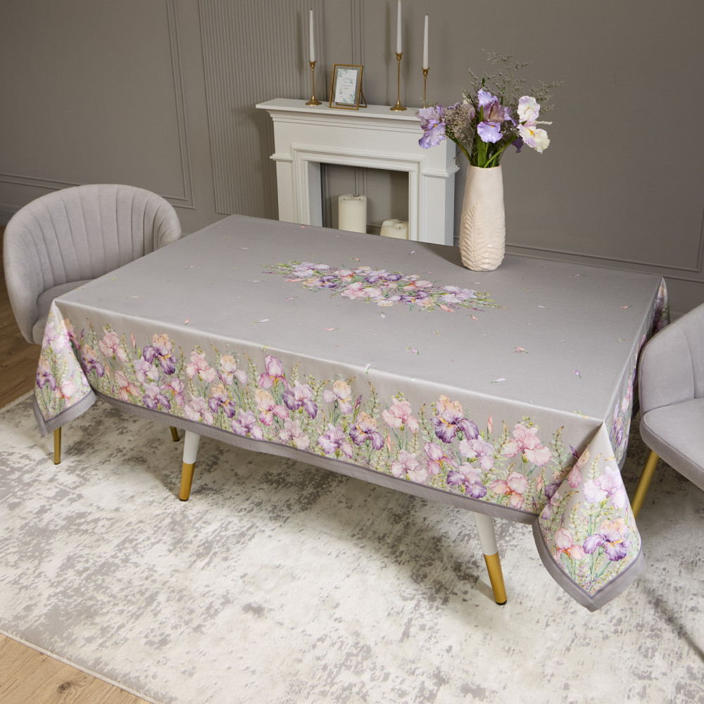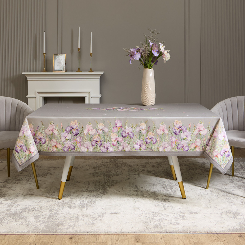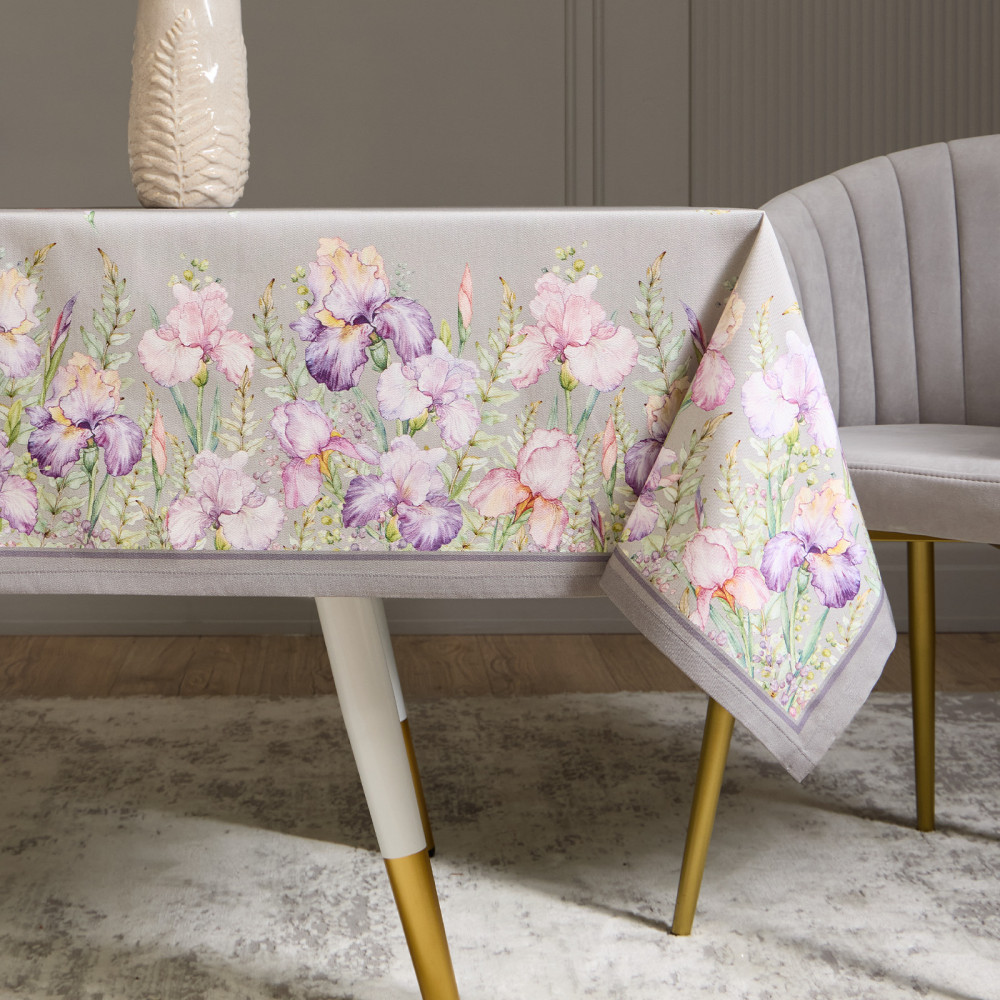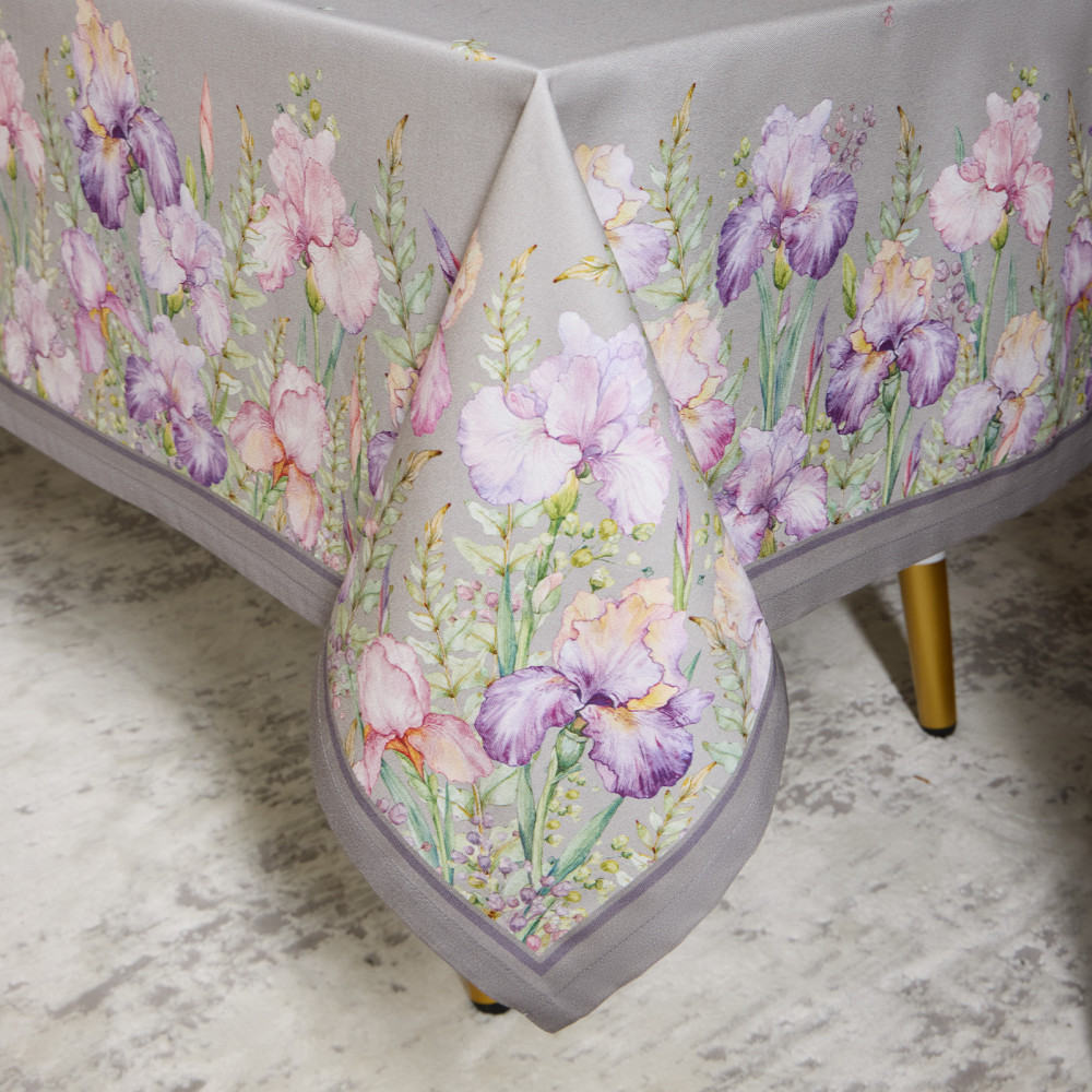 Скатерть создана производителем по эксклюзивному дизайну для серии Ирисы. Прекрасно подойдет для любого стола. Она изготовлена из плотного хлопкового текстиля с водоотталкивающей пропиткой, за счёт которой скатерть становится непромокаемой и с неё легко убрать пролитую жидкость. Плотность ткани составляет 190 гр\м2, она имеет приятную структуру в мелкий рубчик и называется твил. Состав ткани 100% хлопок. Главными преимуществами твила являются износостойкость, плотность и лёгкий красивый блеск. Эта ткань не заламывается и не мнется. Скатерть из твила выглядит аккуратно и элегантно.