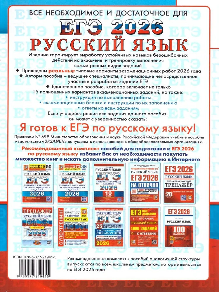 Серия: ЕГЭ. Тесты от разработчиков Авторы заданий — специалисты, принимающие непосредственное участие в разработке заданий ЕГЭ. Пособие содержит 15 типовых вариантов экзаменационных заданий по русскому языку. Все задания составлены с учётом особенностей и требований Единого государственного экзамена, полностью соответствуют демоверсии, спецификации и кодификатору ЕГЭ 2026 года по русскому языку, опубликованным на сайте ФИПИ. Назначение пособия — дать читателям представление о структуре и содержании КИМ по русскому языку, степени трудности заданий. В сборнике даны ответы ко всем вариантам тестов и приводится подробное объяснение выполнения заданий одного варианта. Кроме того, приведены образцы бланков, используемых на ЕГЭ для записи ответов. Пособие адресовано учащимся-старшеклассникам для самоподготовки и самоконтроля, а также учителям для подготовки учащихся к экзамену по русскому языку. |