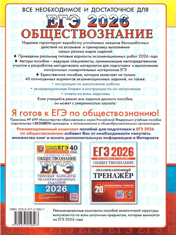 💳 Оплатить за товар можно при получении 🇰🇿 Есть бесплатная доставка по Казахстану от 1 дня 🎁 Копите бонусы с каждой покупки Серия: ЕГЭ. 50 вариантов. Тесты от разработчиков Авторы заданий — ведущие специалисты, принимающие непосредственное участие в разработке заданий ЕГЭ и методических материалов для подготовки к выполнению контрольных измерительных материалов. Пособие содержит 40 типовых вариантов экзаменационных заданий по обществознанию. Все задания составлены с учётом особенностей и требований Единого государственного экзамена, полностью соответствуют демоверсии, спецификации и кодификатору ЕГЭ 2026 года по обществознанию, опубликованным на сайте ФИПИ. Назначение пособия — предоставить читателям информацию о структуре и содержании контрольных измерительных материалов по обществознанию, а также большое количество самых разных видов заданий для выработки устойчивых навыков их выполнения. |