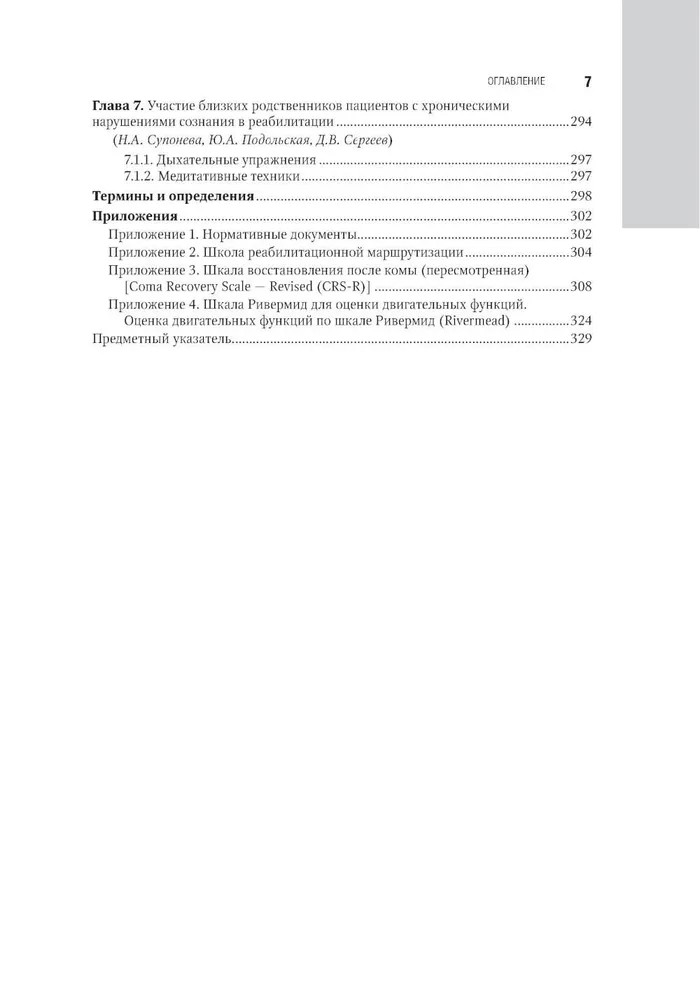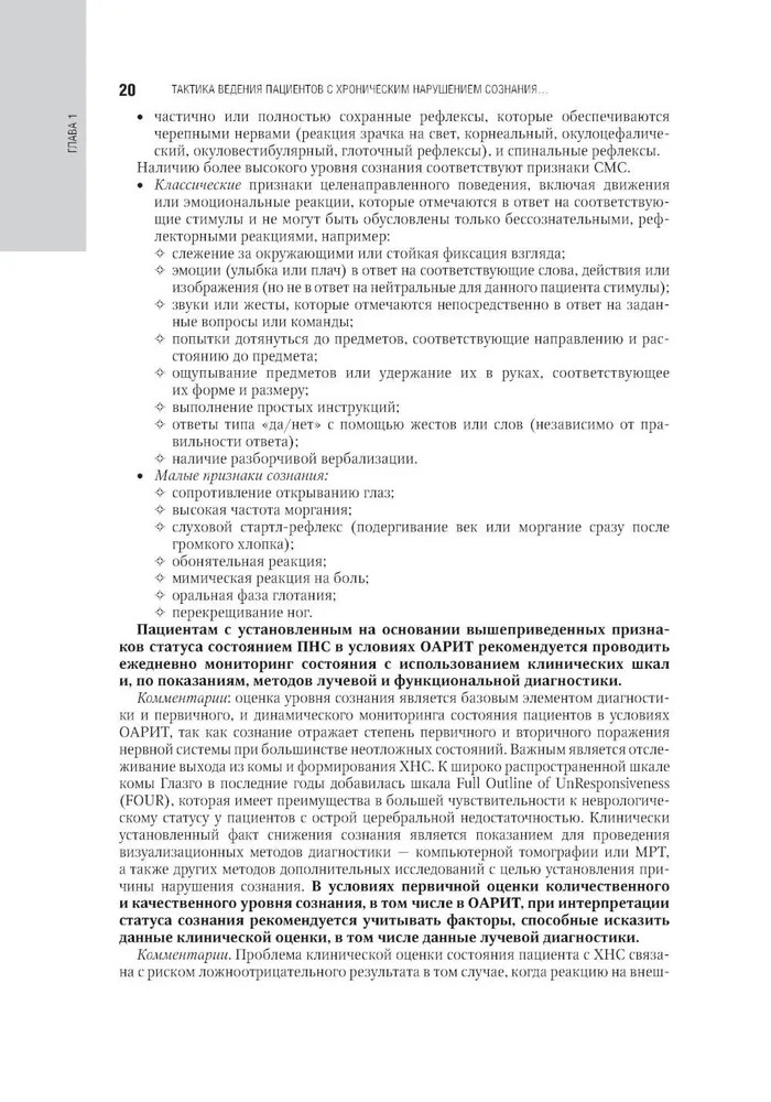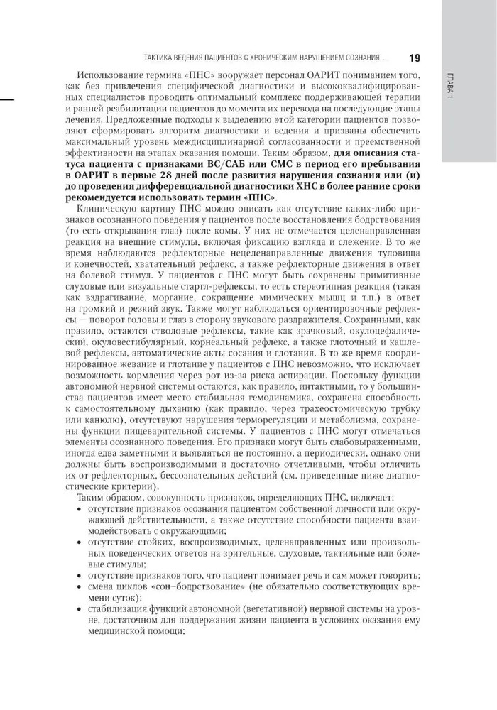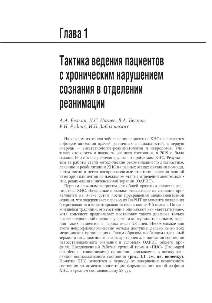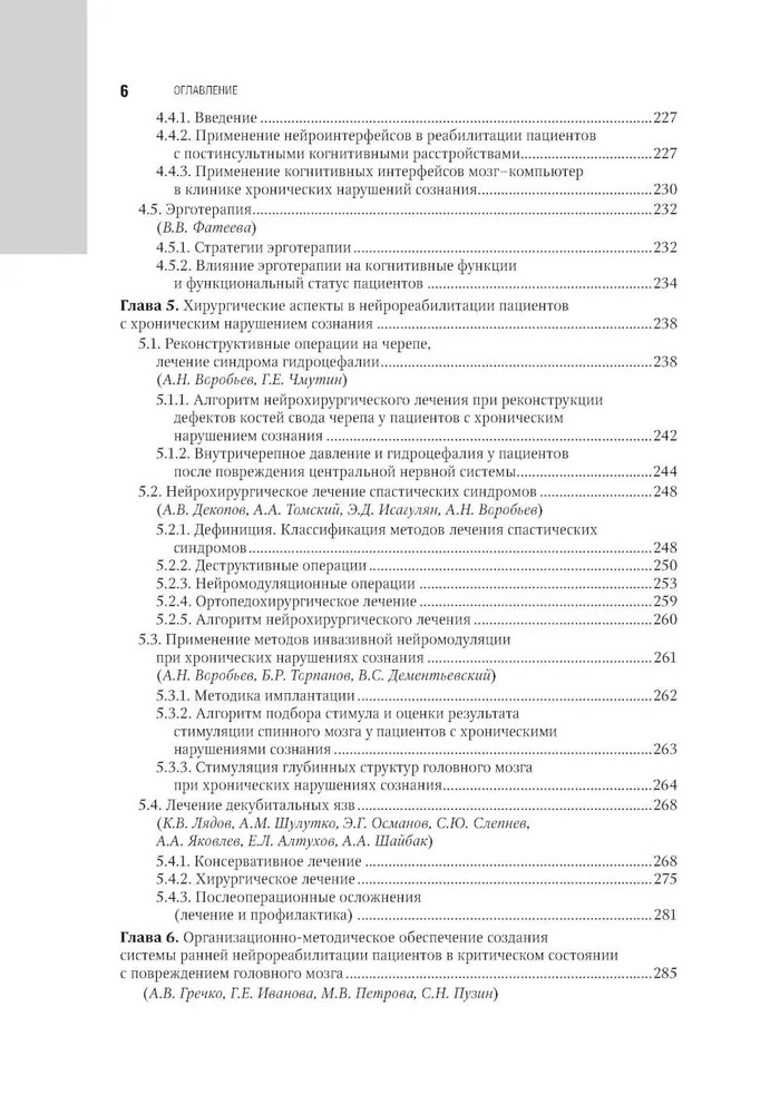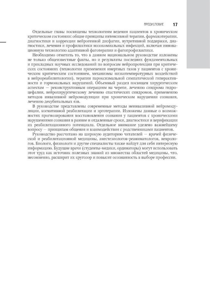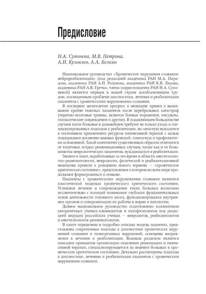 Серия: Национальное руководство В руководстве представлены современные, основанные на последних доказательных национальных и международных исследованиях данные о патогенезе, диагностике, лечении хронических нарушений сознания и нейрореабилитации таких пациентов, приведены алгоритмы клинической и инструментальной диагностики хронических нарушений сознания, включая применение валидированных в Российской Федерации современных неврологических шкал. Отдельно освещены аспекты использования нейрофизиологических методов для диагностики и прогнозирования восстановления сознания у пациентов с хроническим нарушением сознания, основополагающие принципы организационно-методического обеспечения создания системы ранней нейрореабилитации пациентов в критическом состоянии с повреждением головного мозга. Изложены современные возможности органопротекции инертными газами, механизмы низкотемпературных воздействий в нейрореабилитологии, методы транскраниальной стимуляции, когнитивной реабилитации и эрготерапии. |