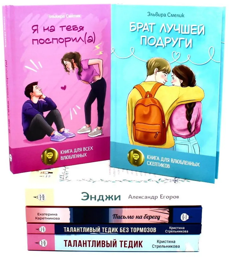Серия: Вместе дешевле В комплекте шесть книг, говорящих с подростками на языке любви. «Талантливый Тедик» и «Талантливый Тедик без тормозов» Кристины Стрельниковой — история уличного музыканта, чья гениальность соседствует с инфантильностью, и девушки, которая верит в него больше, чем он сам. «Письмо на берегу» Екатерины Каретниковой — о сплетенных тайнами судьбах и проверке дружбы на прочность. «Энджи» Александра Егорова — честный роман о токсичных отношениях и поиске настоящей любви. «Я на тебя поспорил(а)» и «Брат лучшей подруги» Эльвиры Смелик — о юношеских чувствах и страстях, которые меняет время. Эти книги — про первую любовь и про ошибки, которые учат. Про взросление, где каждый шаг даётся нелегко, но именно он делает нас собой. |
