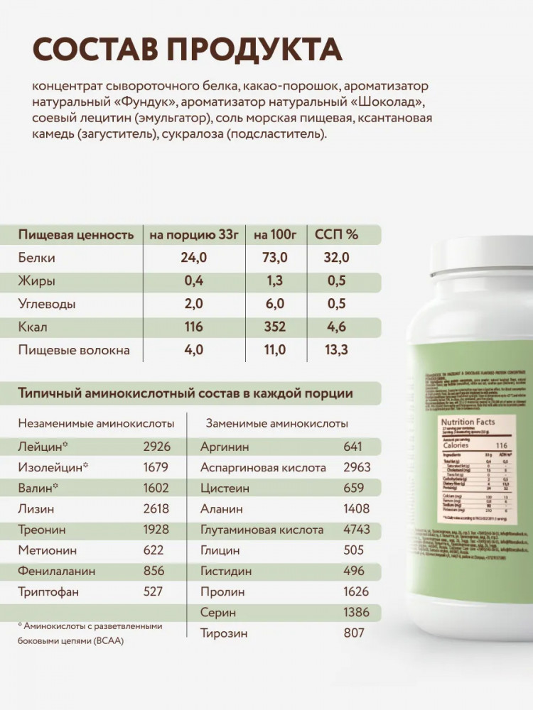 Концентрат сывороточного белка; какао-порошок; ароматизатор натуральный «Фундук»; ароматизатор натуральный «Шоколад»; Соевый лецитин (эмульгатор); соль морская пищевая; ксантановая камедь (загуститель); сукралоза (подсластитель).