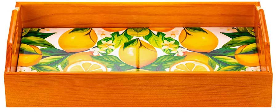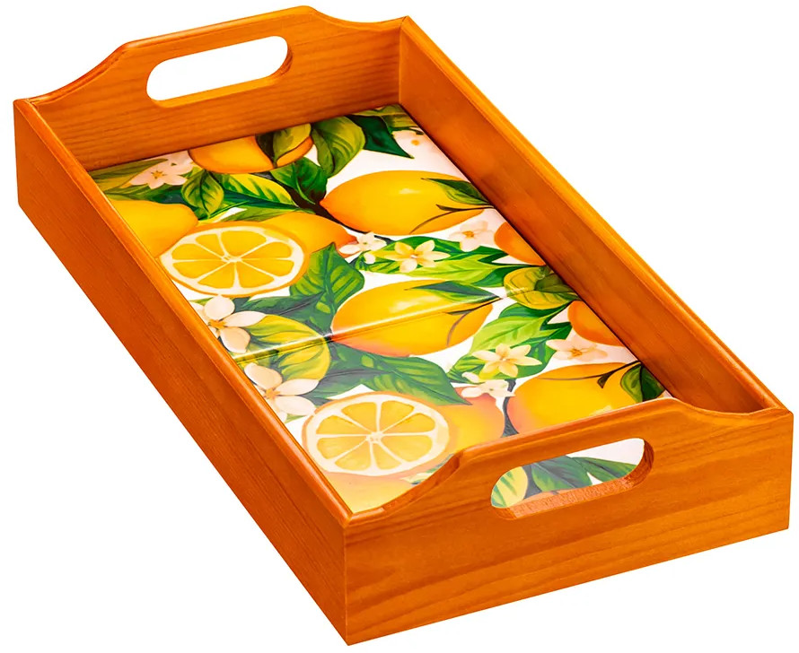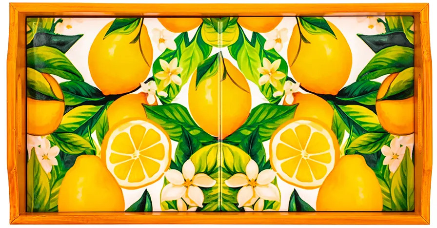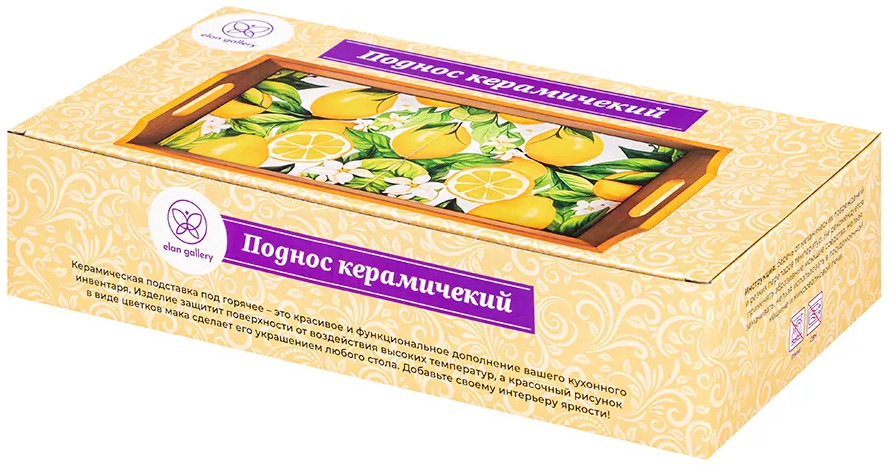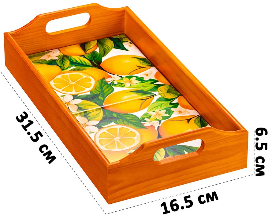 Прямоугольный поднос «Лимоны» от Elan Gallery поможет в эстетичной сервировке любимых блюд. Размер изделия — 31,5×16,5×6,5 см, толщина дна — 1,5 см. Высокие бортики выполнены из дерева, дно сложено из декоративных керамических плиток с ярким орнаментом. Каждое изделие изготавливается вручную, поэтому точный вид орнамента может варьироваться. Поднос идеально подойдёт для эстетичной подачи разнообразных угощений. Заполните его сервировочной посудой — прочные ручки помогут перенести содержимое между комнатами.