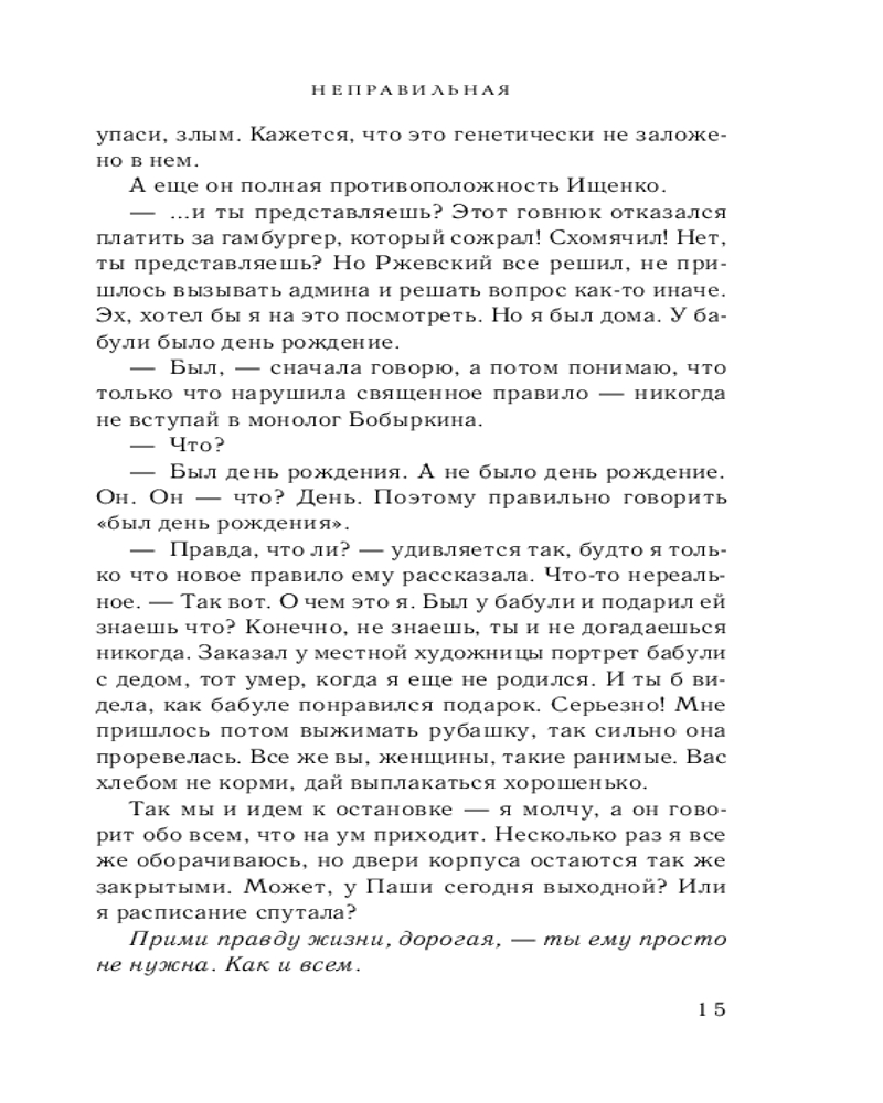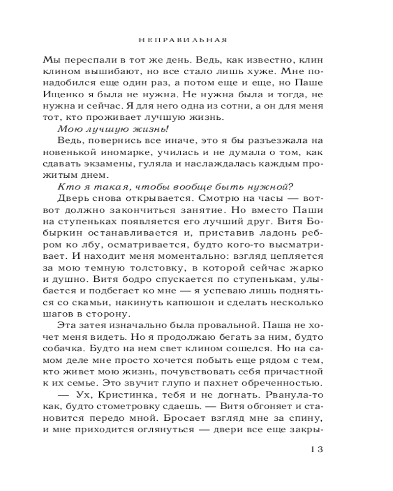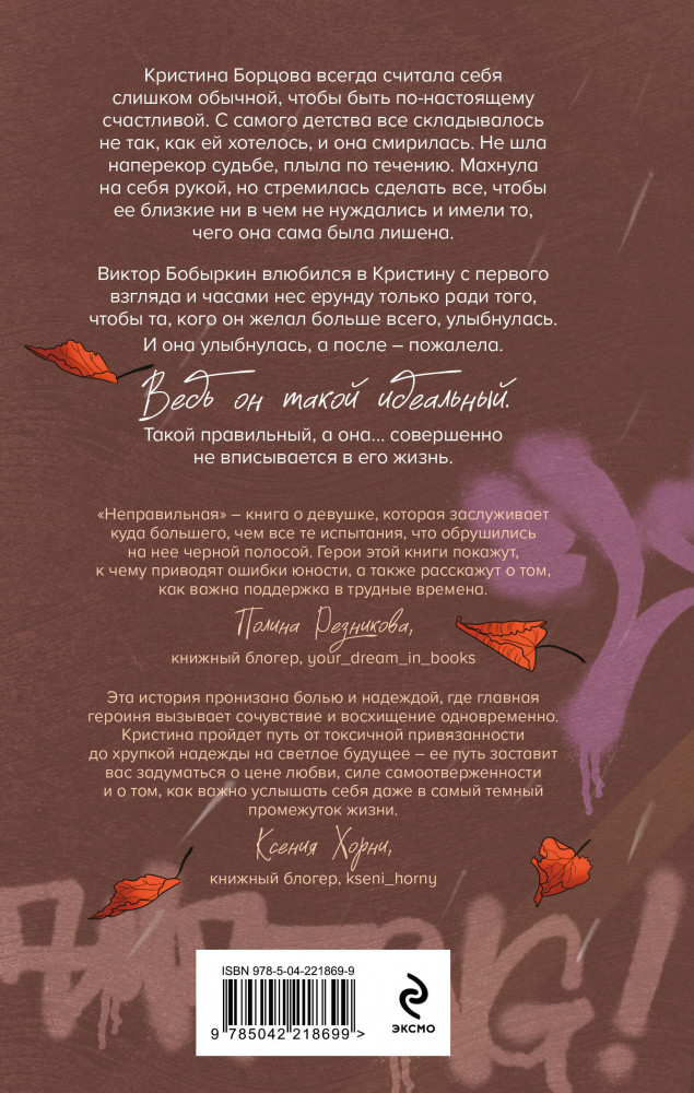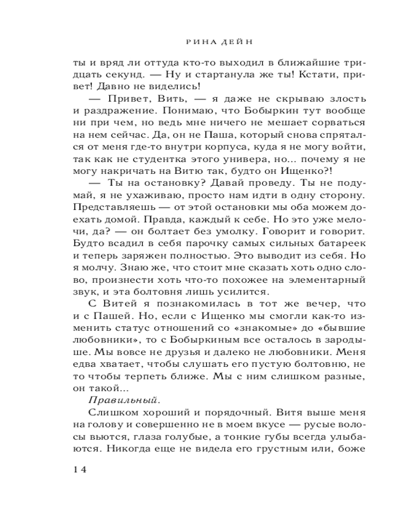 💳 Оплатить за товар можно при получении 🇰🇿 Есть бесплатная доставка по Казахстану от 1 дня 🎁 Копите бонусы с каждой покупки Серия: Темная сторона любви. Романы Рины Дейн Кристина Борцова всегда считала себя слишком обычной, чтобы быть по-настоящему счастливой. С самого детства все складывалось не так, как ей хотелось, и она смирилась. Не шла наперекор судьбе, плыла по течению. Махнула на себя рукой, но стремилась сделать всё, чтобы ее близкие ни в чем не нуждались и имели то, чего она сама была лишена. Виктор Бобыркин влюбился в Кристину с первого взгляда и часами нес ерунду только ради того, чтобы та, кого он желал больше всего, улыбнулась. И она улыбнулась, а после — пожалела. Ведь он такой идеальный. Такой правильный, а она... совершенно не вписывается в его жизнь. |
