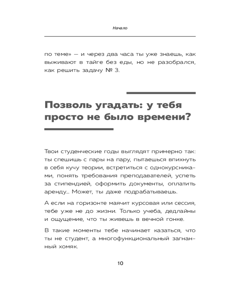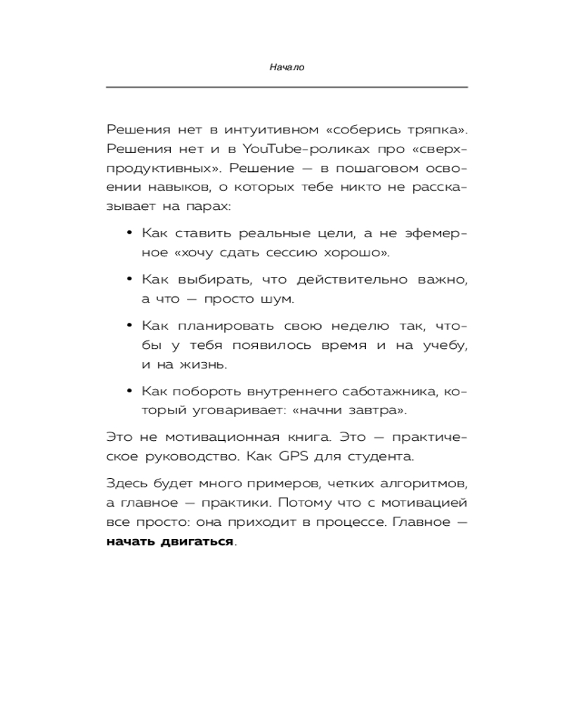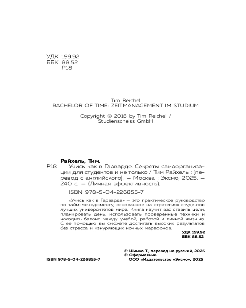 Серия: Личная эффективность. Книги, которые помогают сохранять тонус и фокус «Учись как в Гарварде» — это практичное руководство по тайм-менеджменту, основанное на стратегиях студентов лучших университетов мира. Книга научит вас ставить цели, планировать день, использовать проверенные техники и находить баланс между учебой, работой и личной жизнью. С ее помощью вы сможете достигать высоких результатов без стресса и изнуряющих ночных марафонов. |