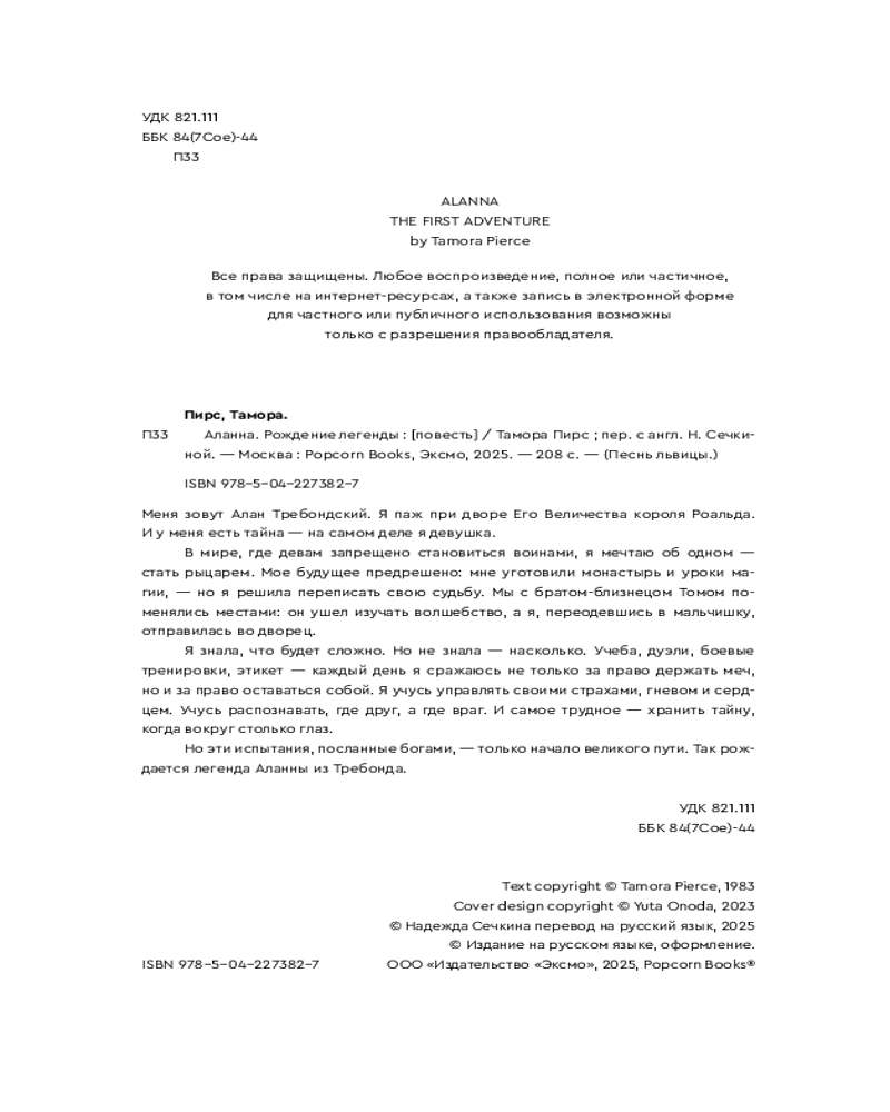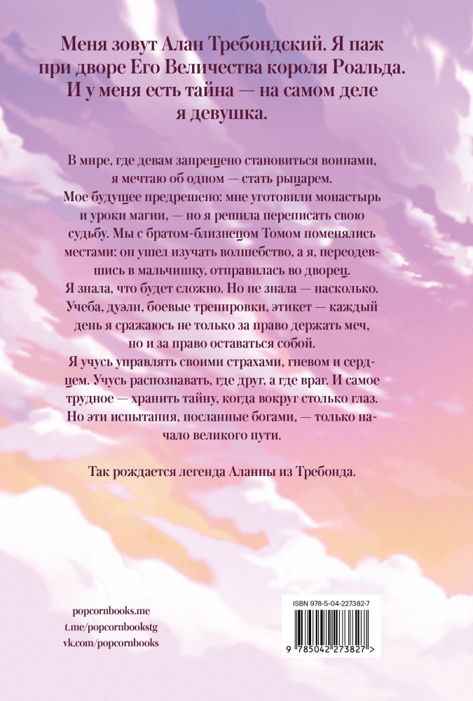 💳 Оплатить за товар можно при получении 🇰🇿 Есть бесплатная доставка по Казахстану от 1 дня 🎁 Копите бонусы с каждой покупки Серия: Popcorn Books. Песнь львицы Меня зовут Алан Требондский. Я паж при дворе Его Величества короля Роальда. И у меня есть тайна — на самом деле я девушка. В мире, где девам запрещено становиться воинами, я мечтаю об одном — стать рыцарем. Мое будущее предрешено: мне уготовили монастырь и уроки магии, — но я решила переписать свою судьбу. Мы с братом-близнецом Томом поменялись местами: он ушел изучать волшебство, а я, переодевшись в мальчишку, отправилась во дворец. |