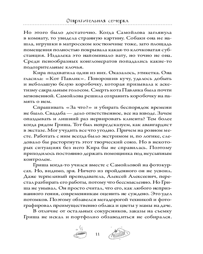 Серия: Детектив под абажуром. Уютные детективы Майи Яворской Лето Кузьмич решает провести у своего старого знакомого на даче и приглашает туда своих друзей — Киру и Кирилла. Обычный дачный поселок, утопающий в зелени, рядом лес, река и сельская церквушка. Казалось бы, райское место. Но одним ранним утором Кира обнаруживает на площадке перед домом отрубленную свиную голову. Крайне неприятное и тревожное зрелище. И если бы это сучилось только раз. Но нет, такие «сюрпризы» появляются регулярно и явно говорят об нешуточной угрозе. Трое неразлучных друзей просто не могут остаться в стороне и начинают свое расследование. |