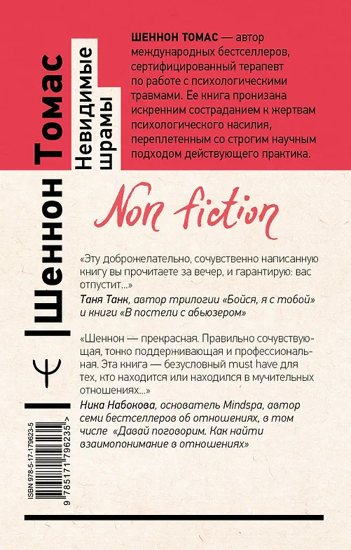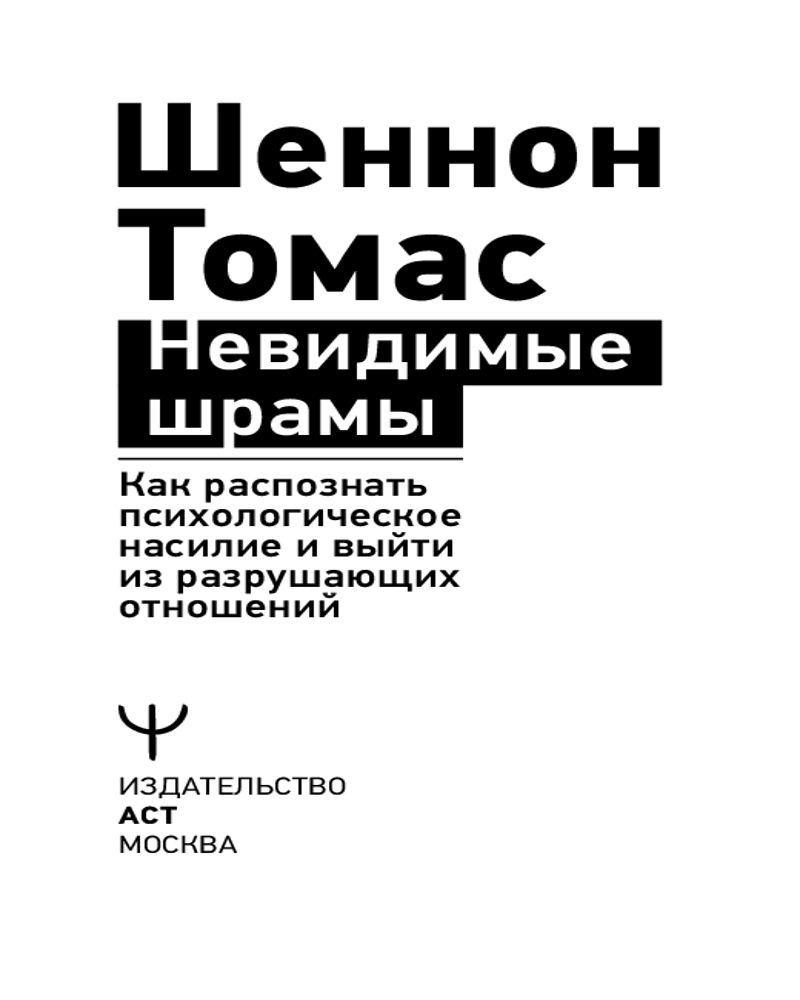 💳 Оплатить за товар можно при получении 🇰🇿 Есть бесплатная доставка по Казахстану от 1 дня 🎁 Копите бонусы с каждой покупки Серия: Эксклюзив: non-fiction Книга «Невидимые шрамы. Как распознать психологическое насилие и выйти из разрушающих отношений» раскрывает сложные механизмы абьюза, его признаки и тактики. Шеннон Томас — признанный эксперт в области психологического насилия, автор международных бестселлеров. Как говорит сама Шеннон, скрытое психологическое насилие — это бич нашего времени. Он страшен тем, что человеку без специального образования очень непросто осознать и описать проблему. В то время как агрессор продолжает разыгрывать новые партии своей ментальной игры. |