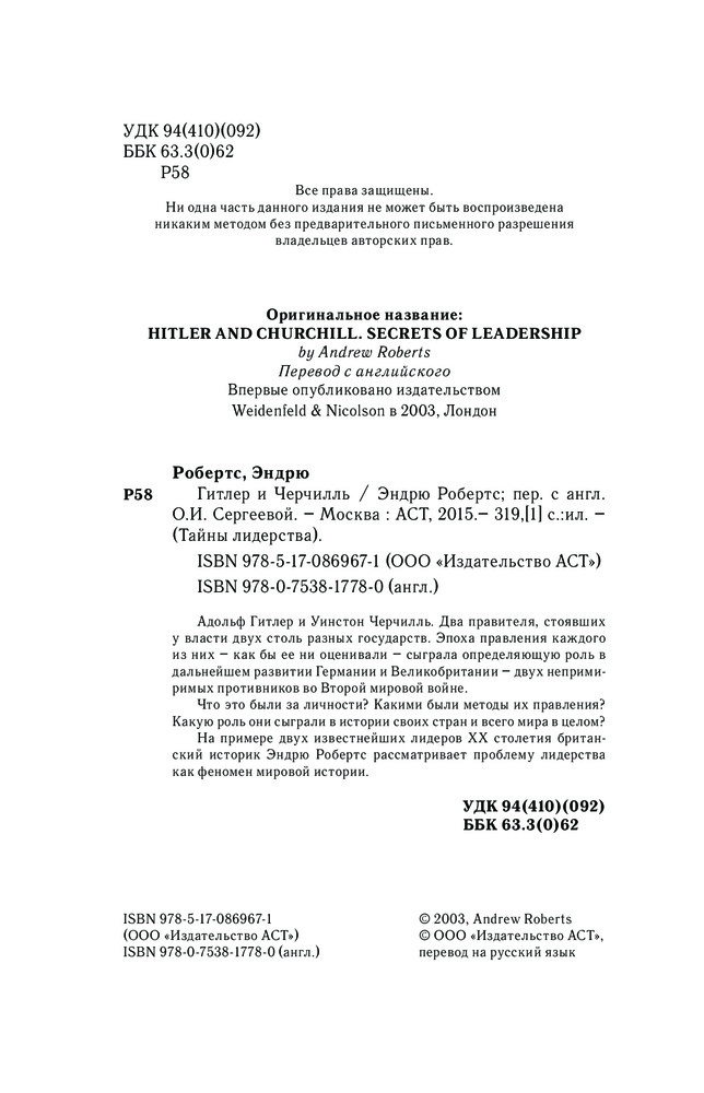 На примере двух известнейших лидеров ХХ столетия британский историк Эндрю Робертс рассматривает проблему лидерства как феномен мировой истории. |