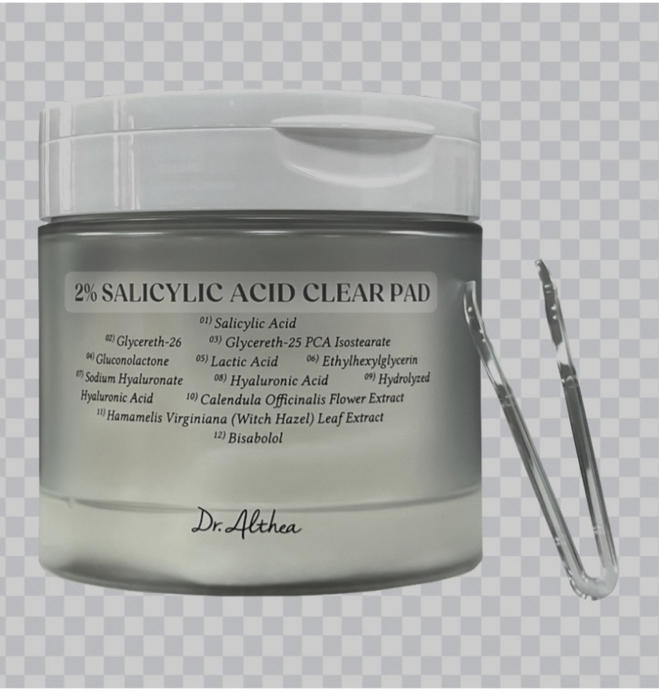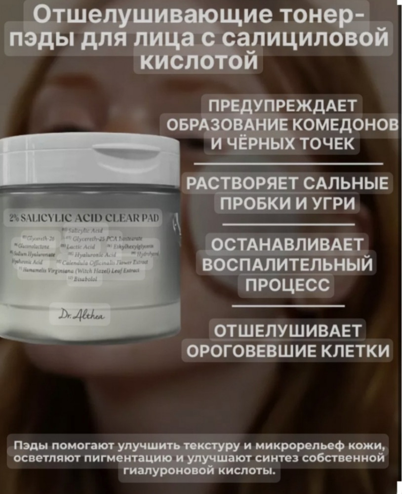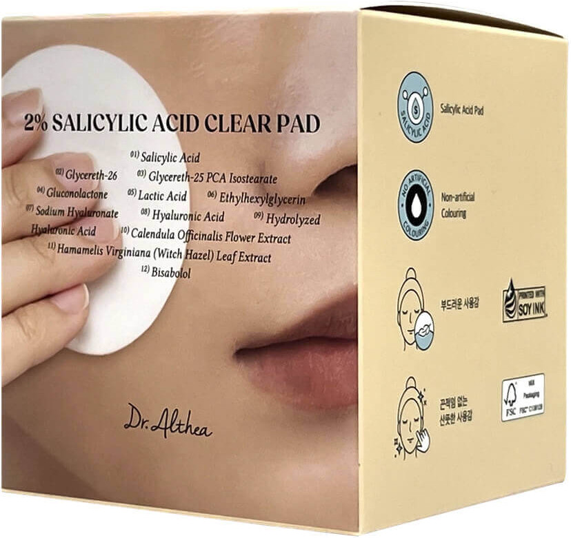 Пэды для проблемной кожи с 2% BHA Dr. Althea 2% Salicylic Acid Clear Pad обеспечивают мягкое отшелушивание, очищают поры, нормализуют выработку себума, препятствуют образованию комедонов, выравнивают микрорельеф. Оказывают противовоспалительное действие, уменьшают воспаления и чёрные точки. Содержат PHA, AHA, гиалуроновую кислоту, бисаболол, экстракты календулы, гамамелиса, чайного дерева.