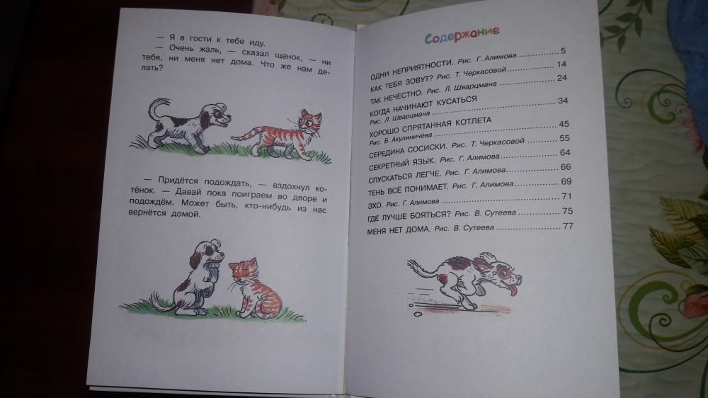 Когда брала книгу, думала, интересно, сколько там рассказов, потому как некоторые мой ребенок уже прочел в других книгах. Поэтому оставлю содержание. Может кому-то пригодится. А так, книга супер. Как раз для легкого чтения "не в напряг". Сын не большой любитель читать. И если уж читает, должны быть картинки в книге обязательно, а то караул! Здесь картинок море, и они красивые, но, правда, щенок разный из-за того, что художников много. А так, книга сыну очень понравилась. И легкая в чтении, и красивая в оформлении.