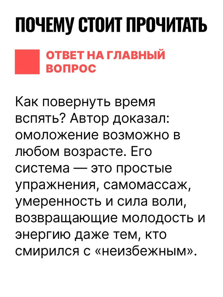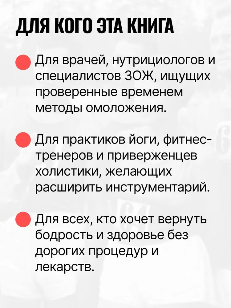 💳 Оплатить за товар можно при получении 🇰🇿 Есть бесплатная доставка по Казахстану 🎁 Копите бонусы с каждой покупки Серия: Омоложение, Долголетие Ключи к долголетию скрыты в нас самих! Мы способны замедлить процесс своего старения, повернув время вспять. Это доказал Сэнфорд Беннетт, «человек, который помолодел в семьдесят лет». Он делится своей уникальной системой, основанной на физической активности, приёмах самомассажа, глубоком дыхании, ментальных привычках и строгой умеренности. |