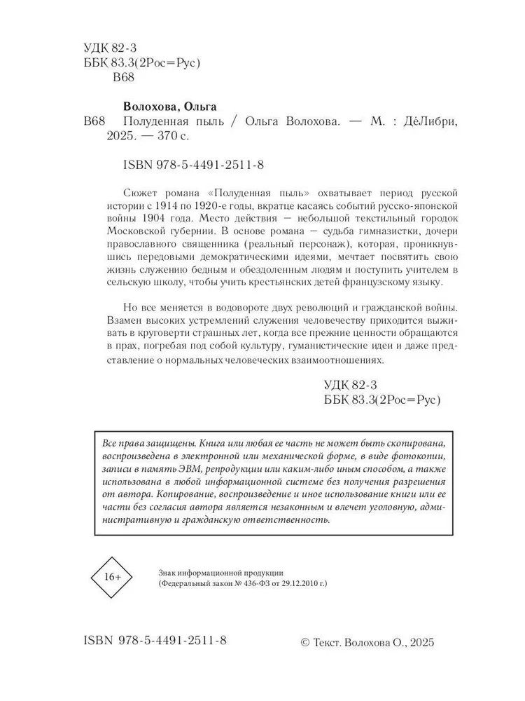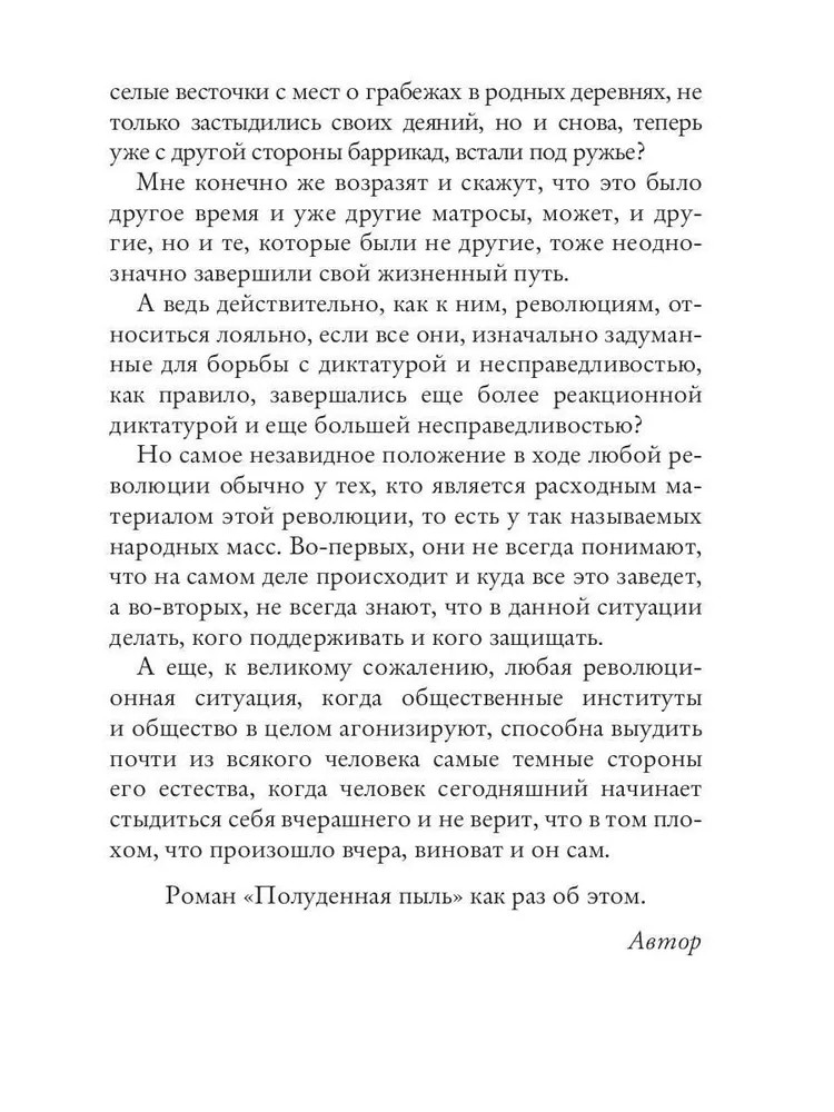Серия: Современная проза Сюжет романа «Полуденная пыль» охватывает период русской истории с 1914 по 1920-е годы, вкратце касаясь событий русско-японской войны 1904 года. Место действия — небольшой текстильный городок Московской губернии. В основе романа — судьба гимназистки, дочери православного священника (реальный персонаж), которая, проникнувшись передовыми демократическими идеями, мечтает посвятить свою жизнь служению бедным и обездоленным людям и поступить учителем в сельскую школу, чтобы учить крестьянских детей французскому языку. Но все меняется в водовороте двух революций и гражданской войны. Взамен высоких устремлений служения человечеству приходится выживать в круговерти страшных лет, когда все прежние ценности обращаются в прах, погребая под собой культуру, гуманистические идеи и даже представление о нормальных человеческих взаимоотношениях. |