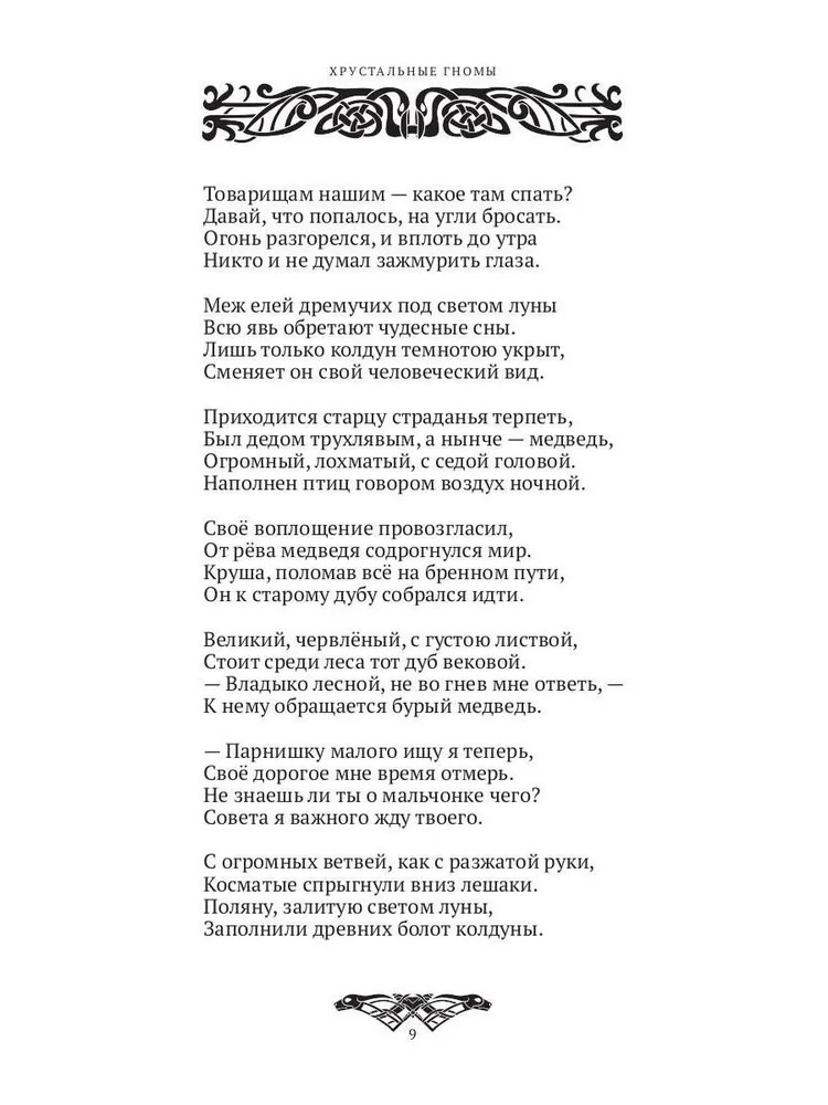 Серия: Современная поэзия «Хрустальные гномы» — масштабная эпическая сказка в стихах, основанная на славянских мифах, былинах и народных преданиях. В центре повествования — старик-колдун и его спутники: стрелок, лекарь и скороход, отправившиеся в опасное путешествие по мрачным лесам, болотам, скалам и подземным царствам, чтобы спасти пропавшего мальчика и противостоять древнему злу. На их пути — испытания, встречи с ведьмами, великанами, колдунами, чудовищами и загадочными хрустальными гномами. Каждый герой проходит путь преодоления, дружбы, мужества и жертвенности, открывая тайны прошлого и преображаясь. Позднее их ждут масштабные битвы за свободу родной земли, любовь и верность. Это история о вечной борьбе добра и зла, о силе души, цене истинных чувств и преодолении страхов — для читателей, ценящих сказочные приключения, героизм и философскую глубину. |