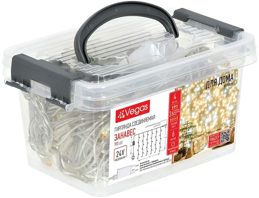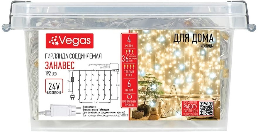 Vegas, Электрогирлянда Занавес, 24V, 192 теплых LED ламп (36 мигающих), в боксе, прозрачный провод, 6 нитей, 1×4 м, с таймером, с блоком питания, удлиняемая. Создайте атмосферу волшебства и уюта с электрогирляндой Занавес от Vegas! Эта стильная гирлянда станет идеальным дополнением для любого праздника, вечеринки или домашнего декора. Гирлянда отлично подойдет для украшения улицы, террасы, окон, а также для создания уютной атмосферы в интерьере. Благодаря своей универсальности станет великолепным акцентом на свадьбах, корпоративных мероприятиях, новогодних праздниках и других торжествах.