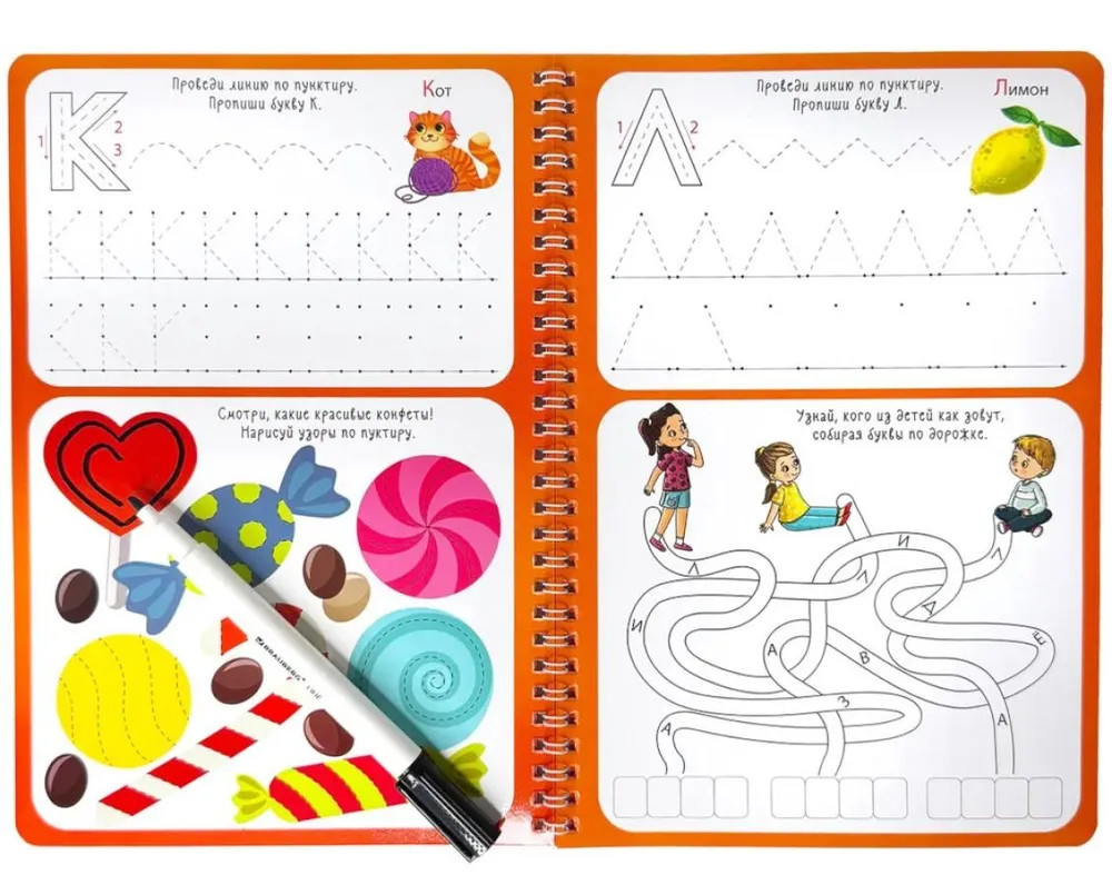 Развивающее пособие, а также лучший подарок на день рождения. Книга предназначена для мальчиков и девочек от 4-х до 7-ми лет, азбука для малышей. Буквы для детей легче запомнить в виде игры, и подготовка к школе станет для ребенка увлекательным занятием как пособие для дошкольников. В комплект входит: упаковка, стираемый маркер и книжка — тетрадь многоразового использования, т. к. маркер легко стирается с поверхности страниц. В сборнике большой выбор различных упражнений: на развитие логики, интеллекта, памяти, внимания, воображения и мелкой моторики рук. Это отличное практическое пособие для изучения букв. Мозг детей лучше всего усваивает новую информацию, если процесс обучения построен как развивающие игры в формате веселой интерактивной игры, которая приносит радость и удовольствие. Такие развивающие игрушки помогут научиться говорить и читать в раннем возрасте, отличная замена современных гаджетов. Ее можно взять с собой в путешествие, чтобы занять ребенка в дороге. |