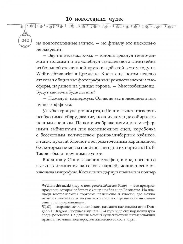 Зима — самое время открыть сборник новогодних рассказов, в котором переплетаются истории разных жанров, создавая чарующий узор! Вдохните морозно-хвойный аромат страниц — и Вы начнете замечать волшебство в обыденных вещах, поразмышляете на тему отношений с самым сказочным праздником, и проживете десять новогодних историй — десять новогодних чудес! Добро пожаловать в пространство, где для волшебства не нужен особый повод, а необыкновенные приключения наполнят морозные деньки теплом, уютом и верой, что в новый год возможно исполнение самых смелых желаний! |
