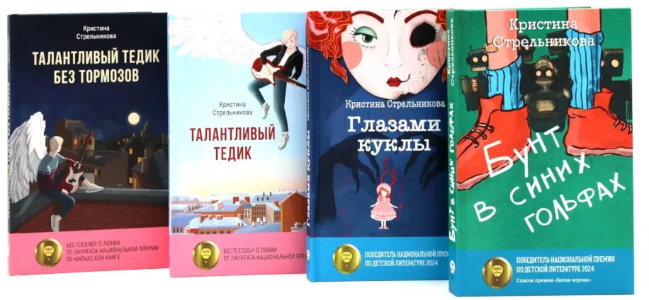 Кристина Стрельникова — лауреат Национальной премии в области детской и подростковой литературы, автор ярких и цепляющих историй. «Глазами куклы» — мистическая повесть о чувствах, спрятанных в игрушечном сердце. «Бунт в синих гольфах» — антиутопия о свободе, в которой героиня бросает вызов жестокой системе. «Талантливый Тедик» и «Талантливый Тедик без тормозов» — трогательная история уличного музыканта, где вдохновение и талант соседствуют с инфантильностью, соблазнами и болезненной славой. Комплект объединяет разные жанры, но в каждой книге — искренний голос автора и её умение говорить с подростками о важном. |