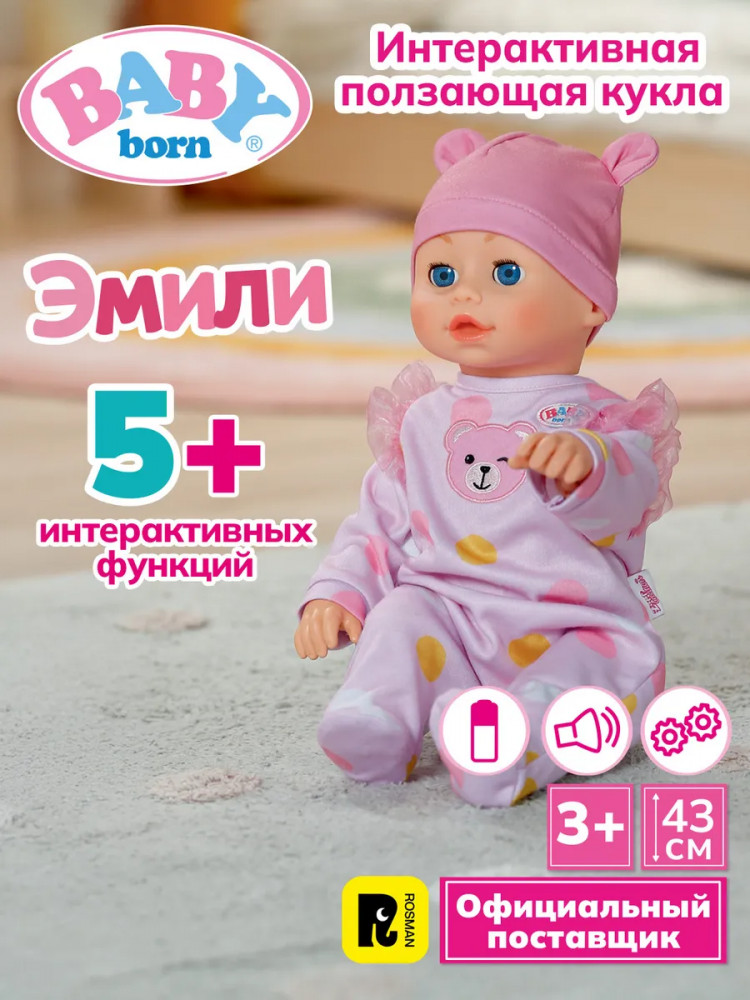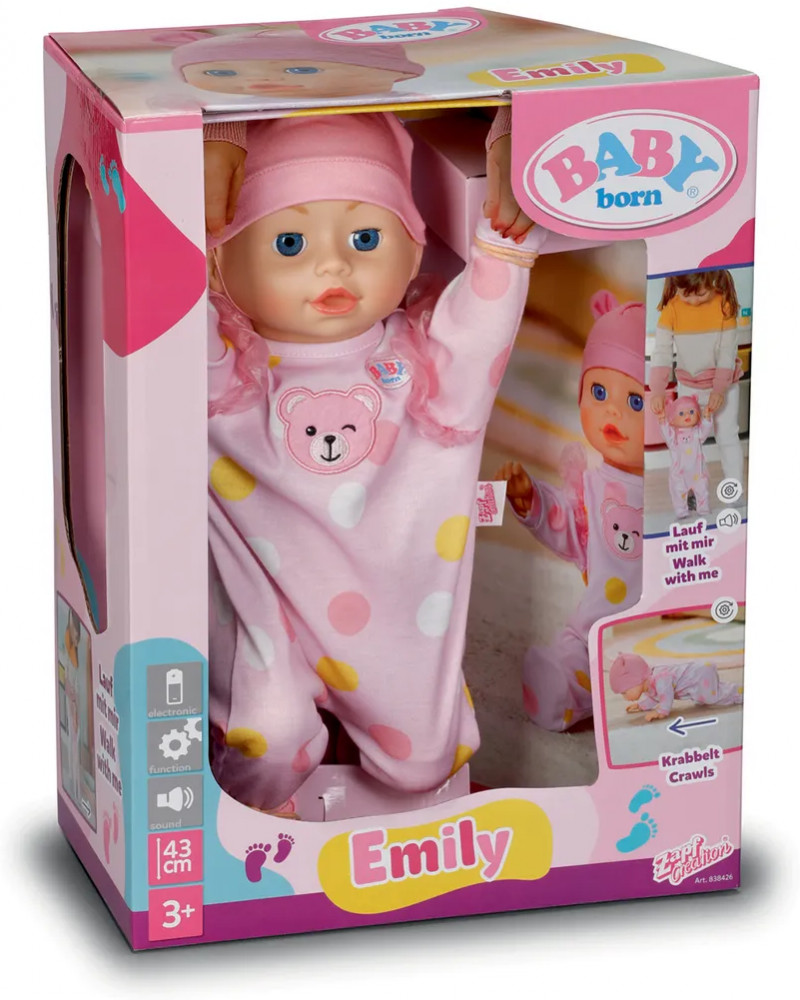 Куклы Беби Борн знакомы каждому из нас с самого детства! Играть в дочки-матери с Беби Борн никогда не станет скучно! Кукла Беби Борн — это не только пупс, за которым нужно ухаживать, но и прекрасный компаньон для больших приключений.Познакомьтесь с куклой Беби Борн Эмили 43 см! Эмили с радостью покажет, как она умеет ползать сама. Чтобы помочь ей поползти, аккуратно согните ей ручки и ножки, слегка поднимите голову и опустите куклу на пол — и она тут же поползет. Нажмите на кнопку у неё на животике, и она будет снова и снова ползать, радуя малыша. А если вдруг она упадёт и заплачет, возьмите ее на руки, чтобы утешить. Помогите Эмили сделать первые шаги: аккуратно поставьте её на ноги, выпрямите ручки и держите за них, пока она учится ходить с вашей поддержкой. |