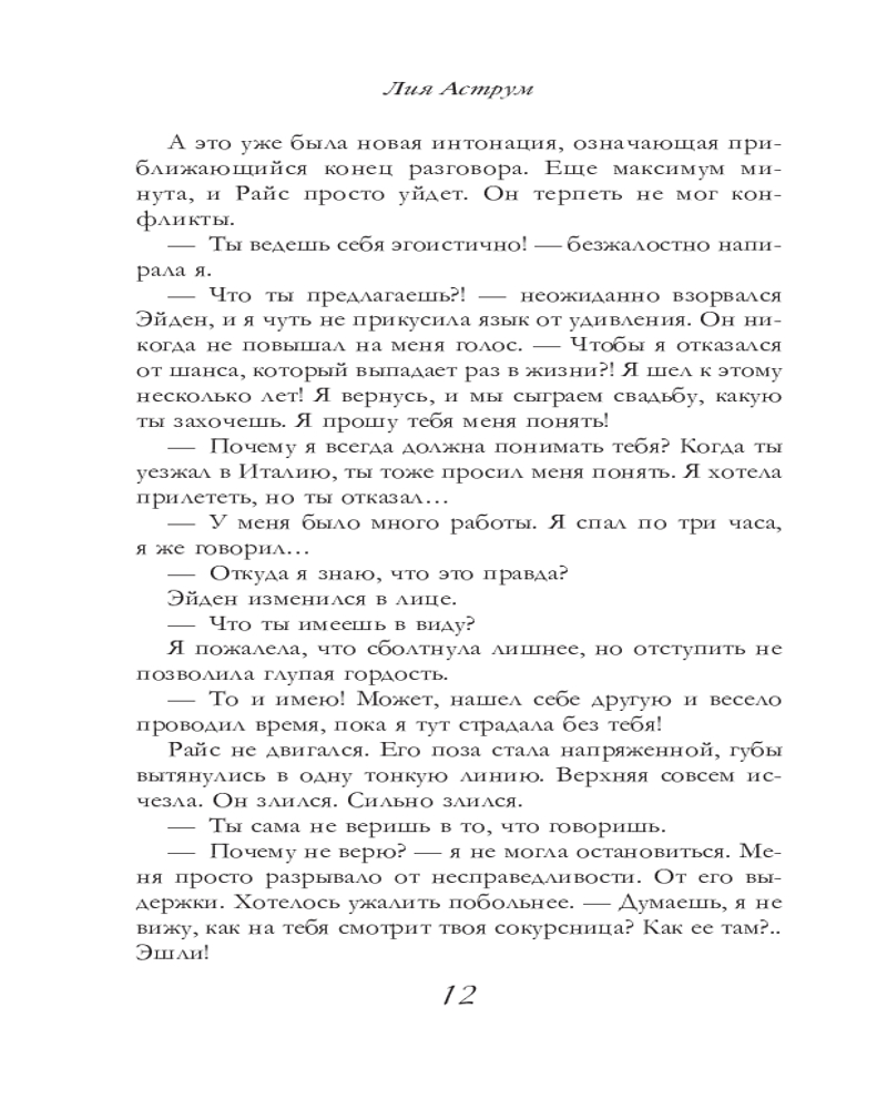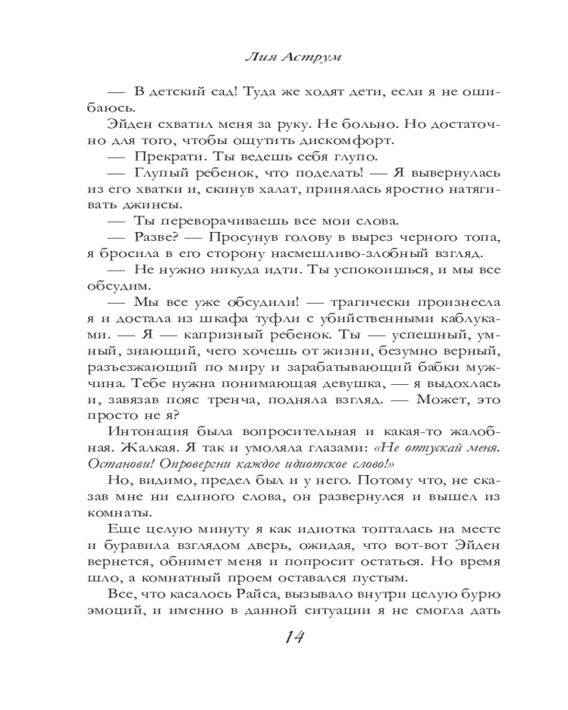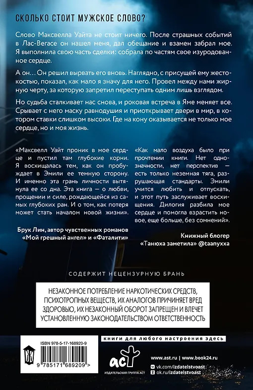 💳 Оплатить за товар можно при получении 🇰🇿 Есть бесплатная доставка по Казахстану 🎁 Копите бонусы с каждой покупки Серия: Оттенки чувств Сколько стоит мужское слово? Слово Максвелла Уайта не стоит ничего. После страшных событий в Лас-Вегасе он нашел меня, дал обещание и взамен забрал мое. Я выполнила свою часть сделки: собрала по частям свое изуродованное сердце. А он... Он решил вырвать его вновь. Наглядно, с присущей ему жестокостью, показал, как мало я значу для него. Провел между нами жирную черту, за которую запретил переступать одним лишь взглядом. Но судьба сталкивает нас снова, и роковая встреча в Яме меняет все. Срывает с него маску равнодушия и приоткрывает двери в мир, в котором ставки слишком высоки. Где на кону оказывается не только мое сердце, но и моя жизнь. |
