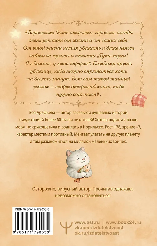 💳 Оплатить за товар можно при получении 🇰🇿 Есть бесплатная доставка по Казахстану 🎁 Копите бонусы с каждой покупки Серия: Элементы счастья Взрослыми быть непросто, взрослые иногда очень устают от жизни и от самих себя. И от этого нельзя убежать, и даже нельзя зайти за кулисы и сказать: «Туки-туки! Я в домике, у меня перерыв». А иногда так хочется спрятаться в убежище хоть на десять минут. Все мы иногда черепашки, которых жизнь переворачивает на панцирь и оставляет беспомощно барахтаться лапками вверх. В такие моменты очень хочется сбежать в тайный уголок, подальше от проблем и вечной усталости. Вот тебе такое убежище — эта книга. |