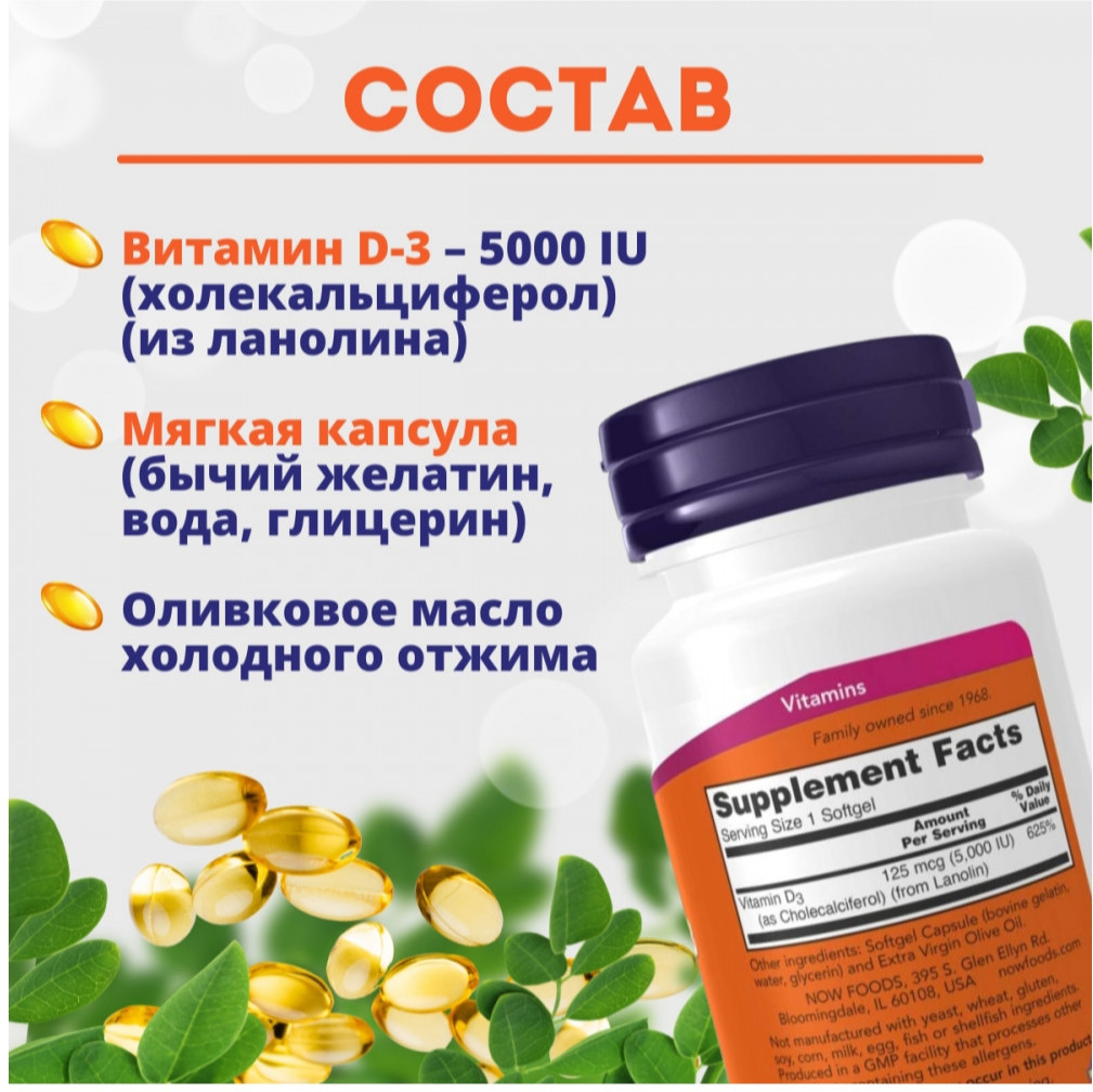 Произведено на предприятии, имеющем регистрацию надлежащей производственной практики (GMP). Капсулы с витамином D3 от компании NOW® предоставляют этот важнейший витамин в легкоусвояемой жидкой форме. Обычно витамин D попадает в организм из еды либо вырабатывается кожей под воздействием солнечных ультрафиолетовых лучей. Однако в еде он содержится в недостаточном количестве. Поскольку многие люди стремятся избегать воздействия солнца, то необходимость в дополнительном приеме витамина D становится все более насущной. |