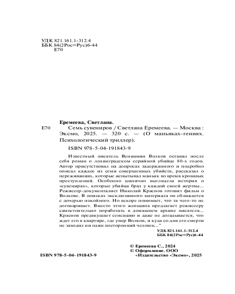 💳 Оплатить за товар можно при получении 🇰🇿 Есть бесплатная доставка по Казахстану 🎁 Копите бонусы с каждой покупки Серия: Эго убийцы. Триллер-откровение Не стоит читать чужие дневники. Они могут превратить вашу жизнь в кошмар… Что может рассказать квартира писателя, пустующая со дня его смерти? Кто обитает на страницах его неопубликованных черновиков? Что, если именно там притаились страхи и мысли кровавых маньяков, которые только и ждут, чтобы кто-то неосторожный выпустил их на свободу… |