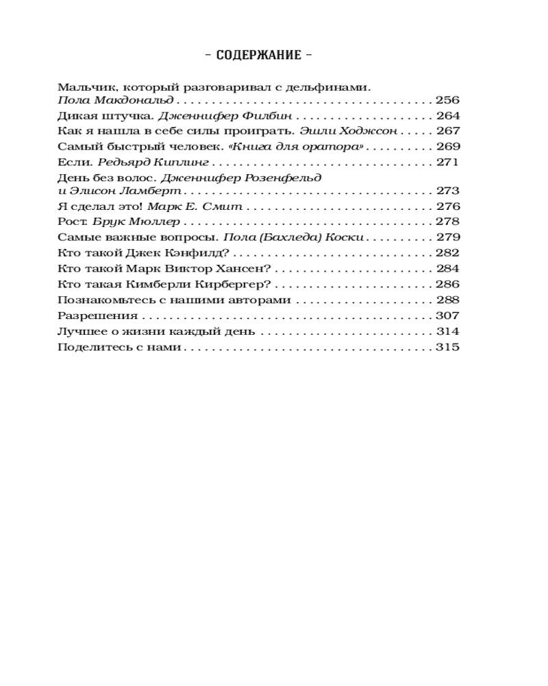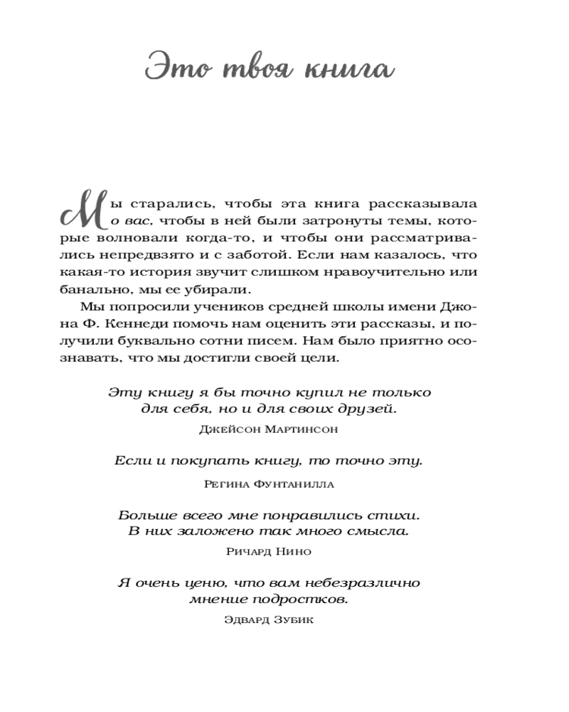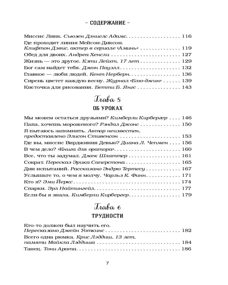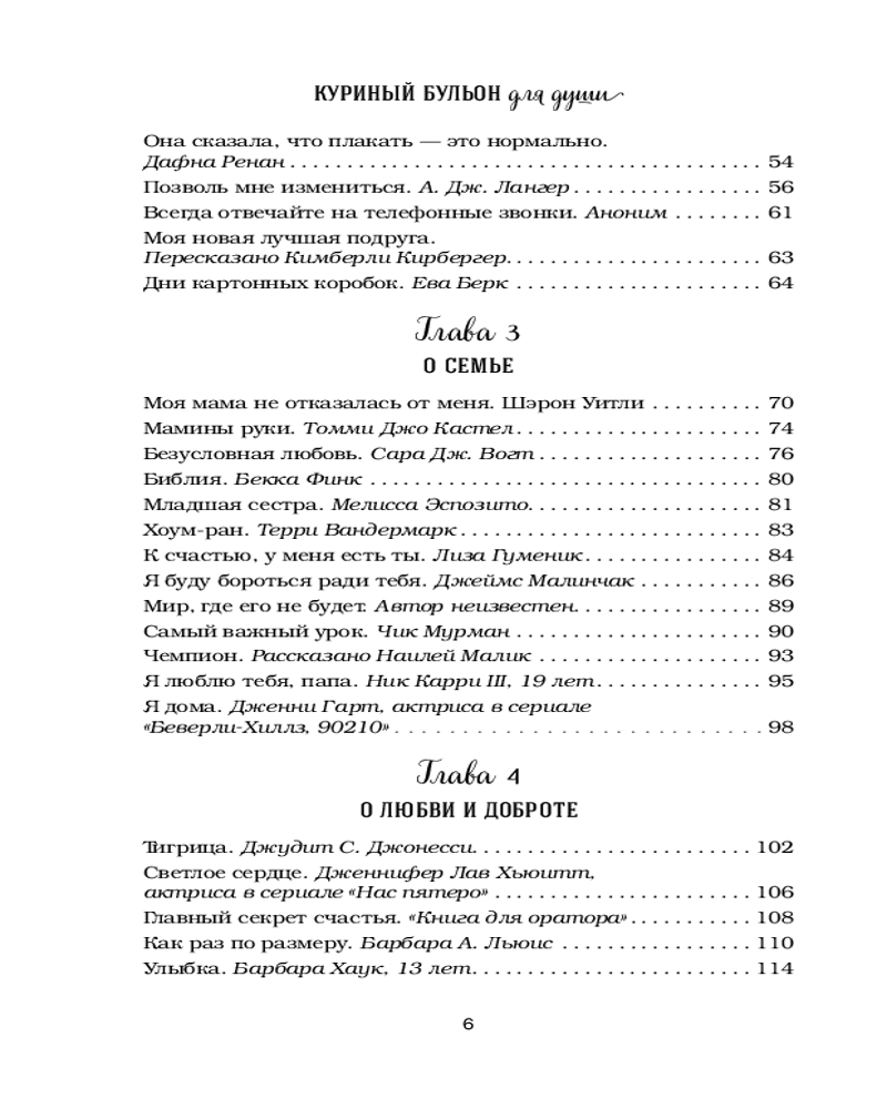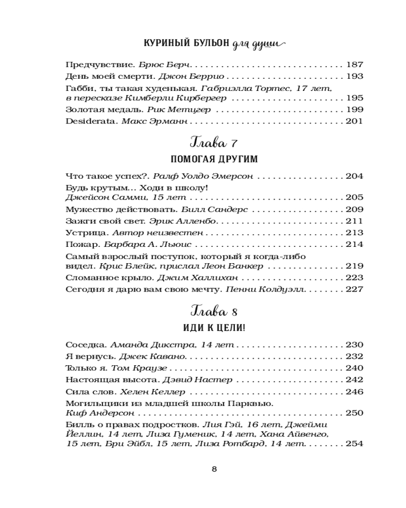 Серия: Куриный бульон для души В детстве, когда вы болели, ваша бабушка давала вам куриный бульон. Сегодня питание и забота нужны вашей душе. Маленькие истории из «Куриного бульона» исцелят душевные раны и укрепят дух, дадут вашим мечтам новые крылья и откроют секрет самого большого счастья — счастья делиться и любить. Помните, как впервые испытали чувство влюблённости, когда сердце колотится от одного его взгляда через школьный коридор? Когда спланированный побег с уроков был захватывающим приключением, а расставание на лето с друзьями казалось концом света? Истории из этого сборника перенесут вас в дни юности — трогательные, наивные, местами смешные, такие знакомые. |