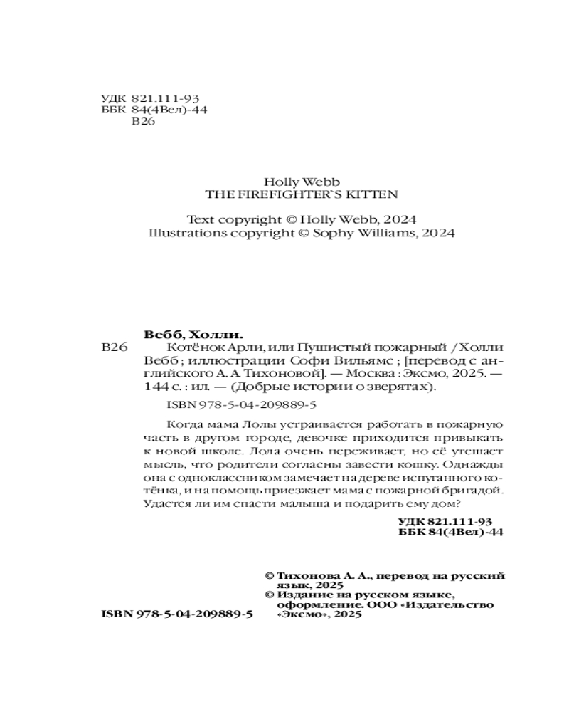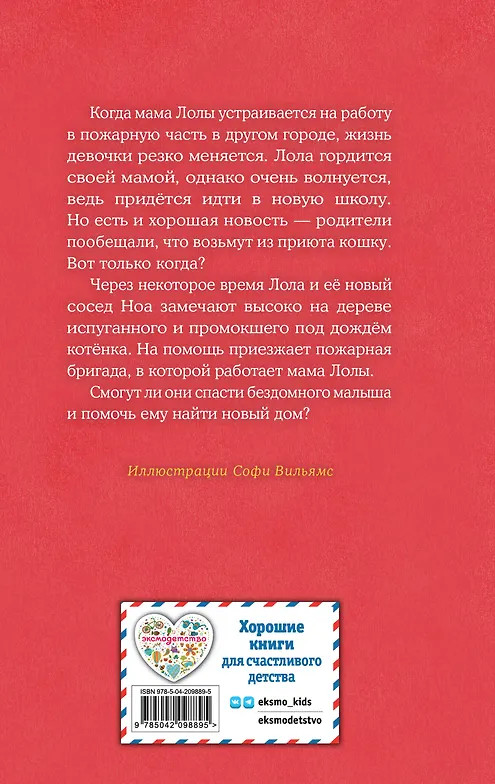 Серия: Холли Вебб. Добрые истории о зверятах. Мировой бестселлер Когда мама Лолы устраивается работать в пожарную часть в другом городе, девочке приходится привыкать к новой школе. Лола очень переживает, но её утешает мысль, что родители согласны завести кошку. Однажды она с одноклассником замечает на дереве испуганного котёнка, и на помощь приезжает мама с пожарной бригадой. Удастся ли им спасти малыша и подарить ему дом? |
