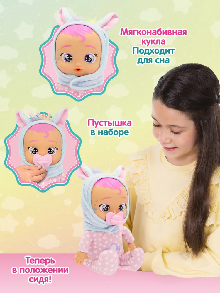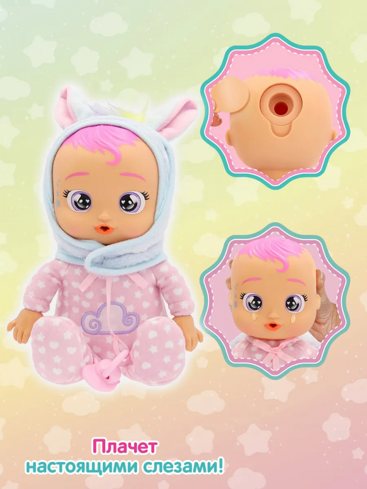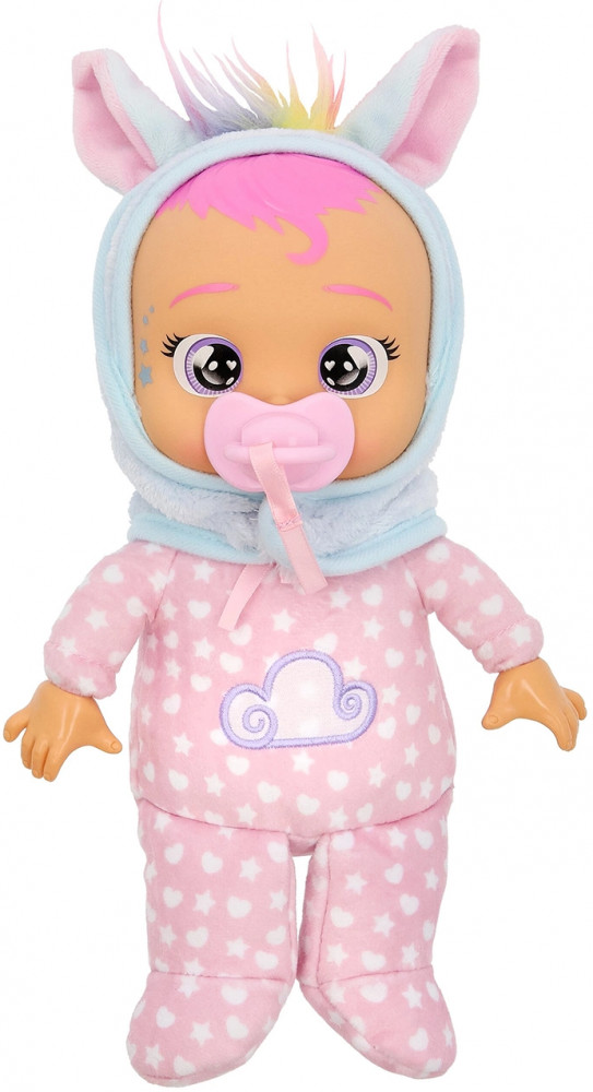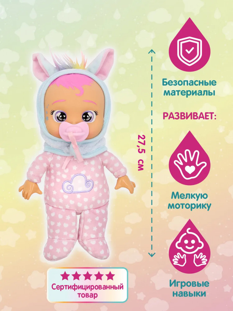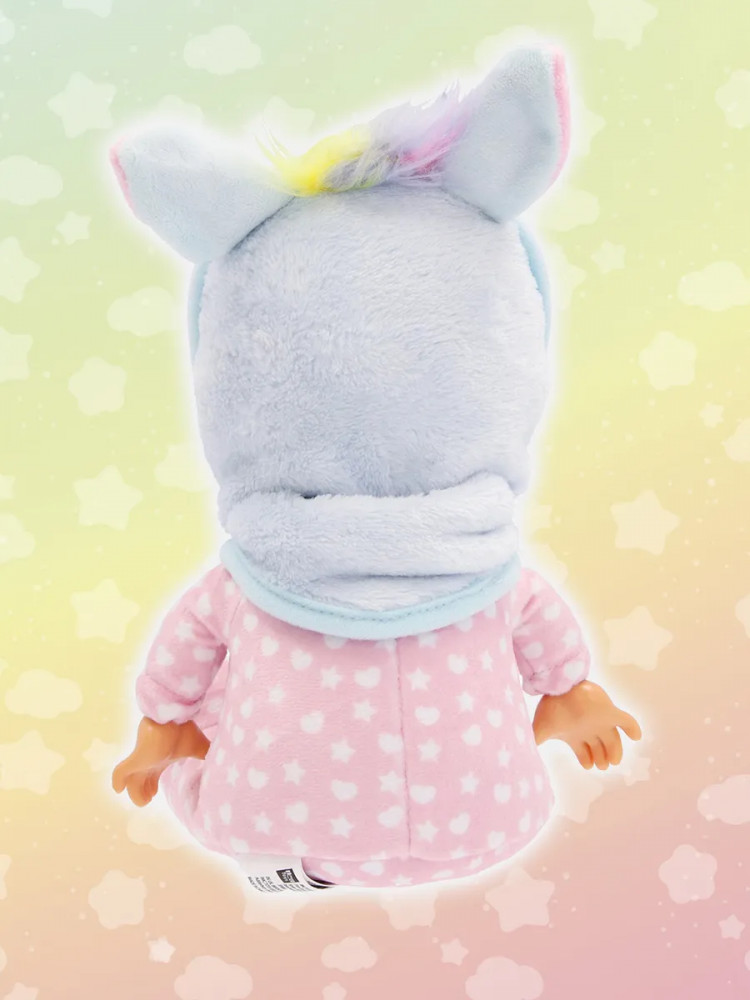 Но не стоит расстраивать обворожительную малышку! Если нажать на ее голову, она начнет плакать настоящими слезами. Обними Дженну и дай пустышку или расскажи ей веселую историю, и Малышка снова станет счастливой! Обаятельная Дженна носит с собой полотенчико, сочетающееся с ее модной пижамой-пегасом.