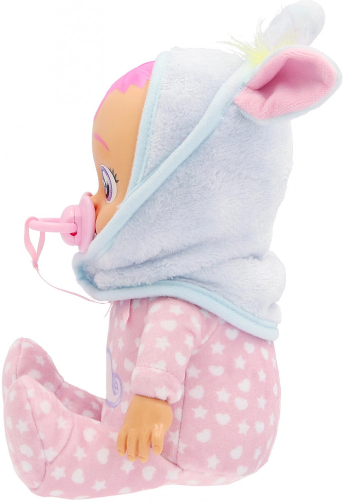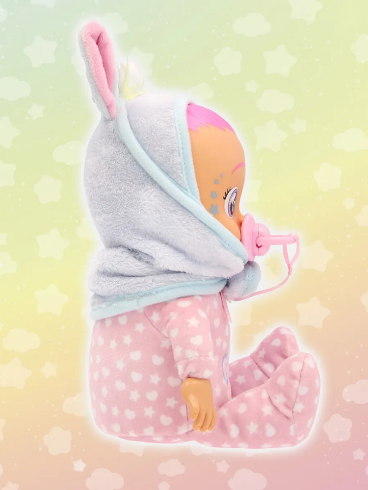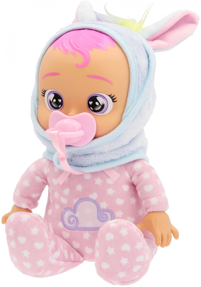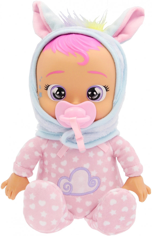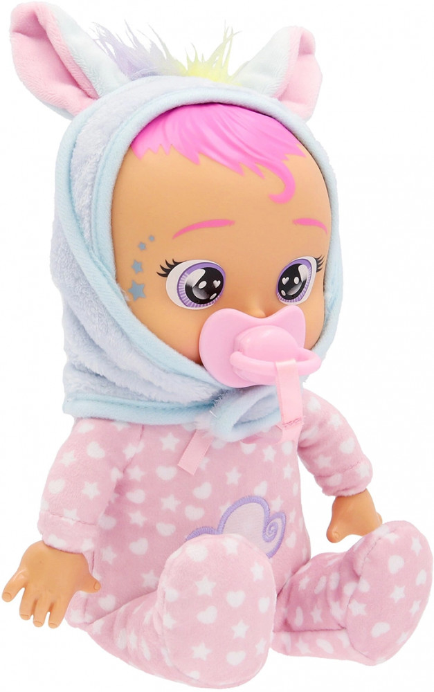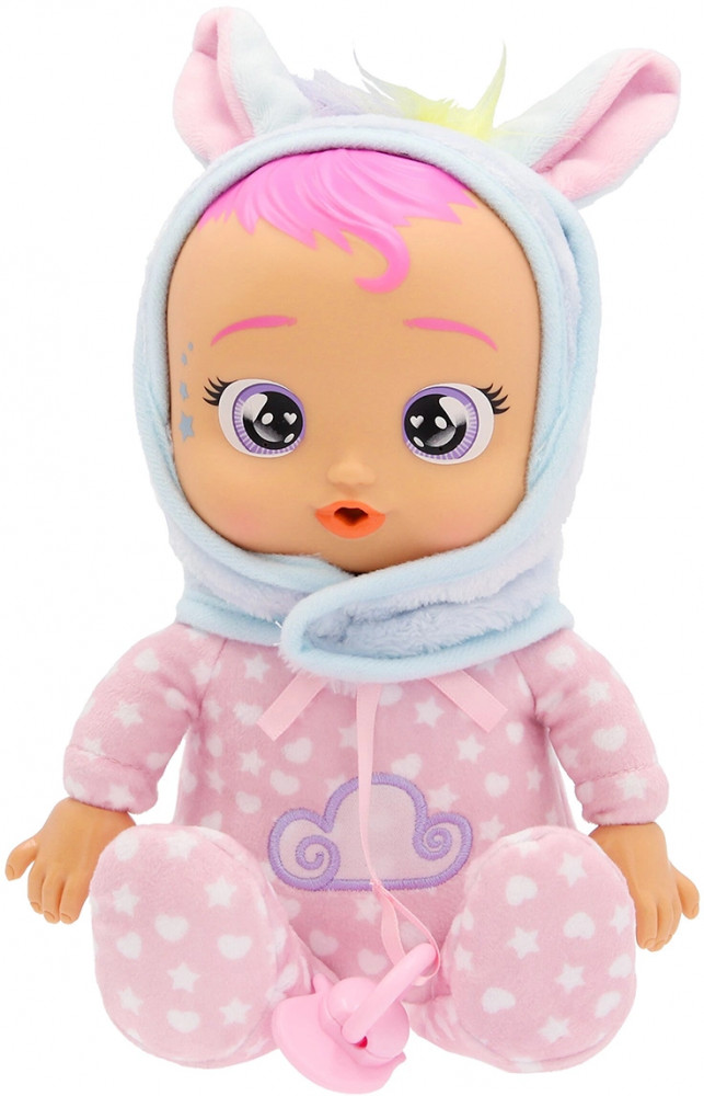 Но не стоит расстраивать обворожительную малышку! Если нажать на ее голову, она начнет плакать настоящими слезами. Обними Дженну и дай пустышку или расскажи ей веселую историю, и Малышка снова станет счастливой! Обаятельная Дженна носит с собой полотенчико, сочетающееся с ее модной пижамой-пегасом.