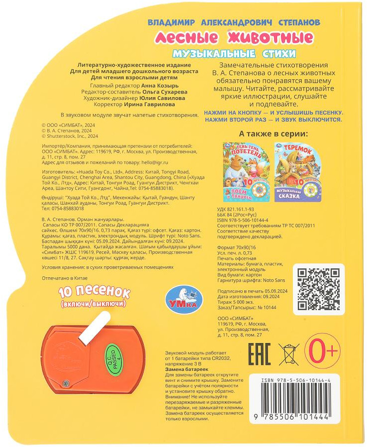 Серия: 1 кнопка 10 песен Музыкальная книга «В. Степанов. Лесные животные» ТМ «УМка» станет прекрасным подарком для ребёнка. Малыш будет с удовольствием рассматривать яркие страницы с изображением животных, читать стихи и слушать песенки о них. Одно нажатие на кнопку — песенка включится, второе нажатие — выключится, при третьем нажатии заиграет следующая композиция. Книжка сделана из плотного картона, поэтому родители могут не опасаться, что ребёнок порвёт её. Благодаря компактному формату книгу удобно брать с собой. |