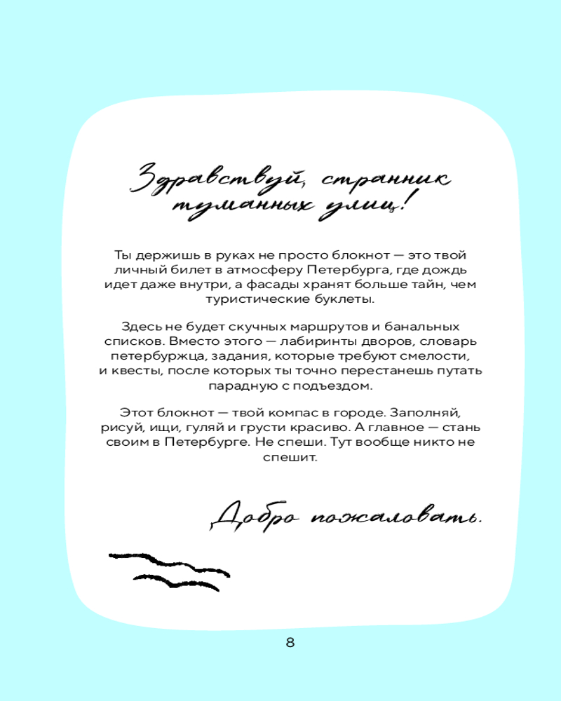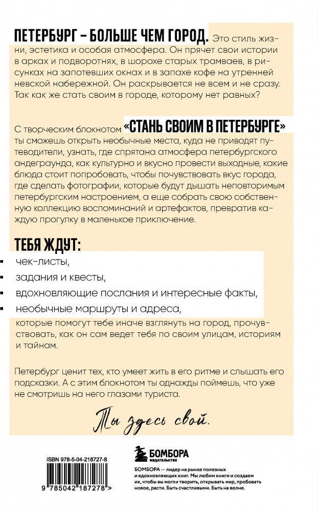 💳 Оплатить за товар можно при получении 🇰🇿 Есть бесплатная доставка по Казахстану от 1 дня 🎁 Копите бонусы с каждой покупки Серия: Туризм в деталях. Самые интересные прогулки Петербург — больше, чем город. Это стиль жизни, настроение, эстетика и атмосфера. Хочешь узнать, как чувствуют этот город его жители? Тогда творческий блокнот «Стань своим в Петербурге» — то, что тебе нужно. Это твой личный компас по нетуристическим местам, таинственным аркам, легендам подъездов и мостов, которые невозможно не полюбить. Ты будешь не просто гулять, а фланировать. Не смотреть, а замечать. Не фотографировать, а превращать моменты в истории. Здесь каждый разворот — повод выйти из дома, открыть новое и запечатлеть свое личное «я» в этом городе. И кто знает — может, уже завтра ты скажешь: «Я стал своим в Петербурге». |